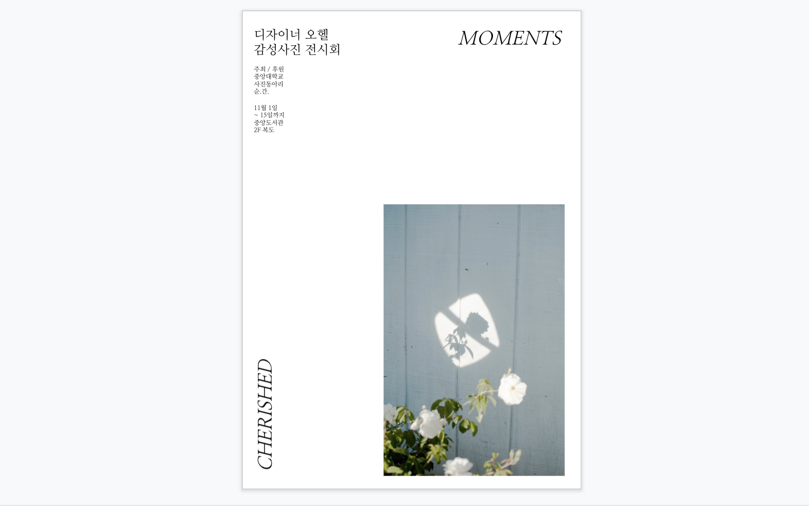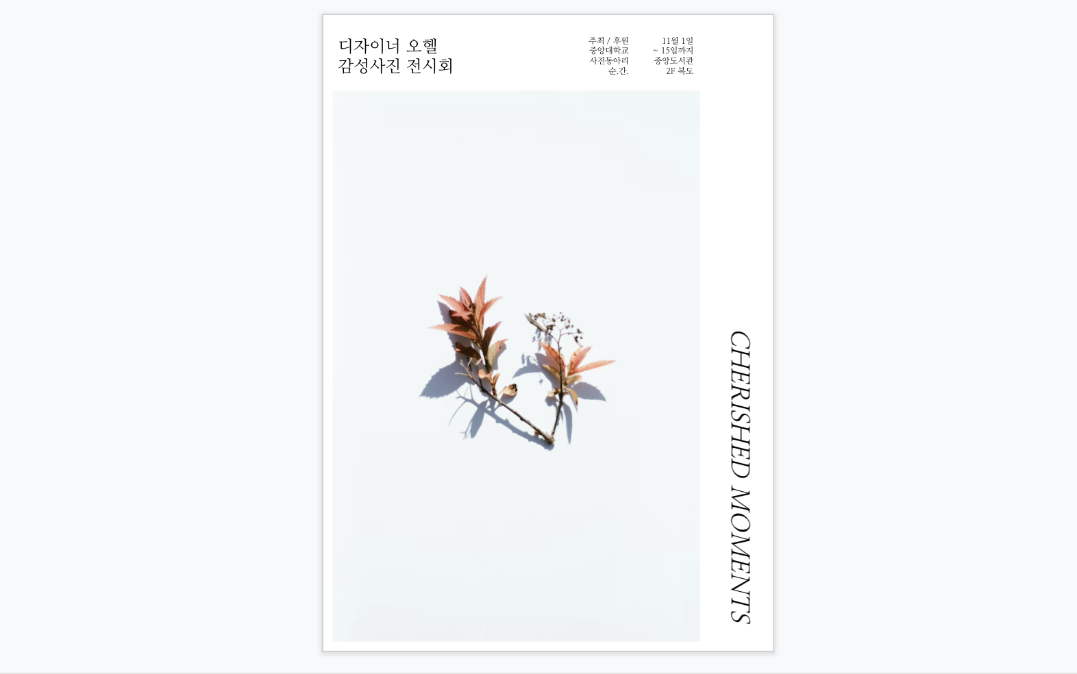 CHERISHED MOMENTS 디자이너 오헬 감성사진 전시회 11월 1일 ~ 15일까지 중앙도서관 2F 복도 주최 / 후원 중앙대학교 사진동아리 순.간.
