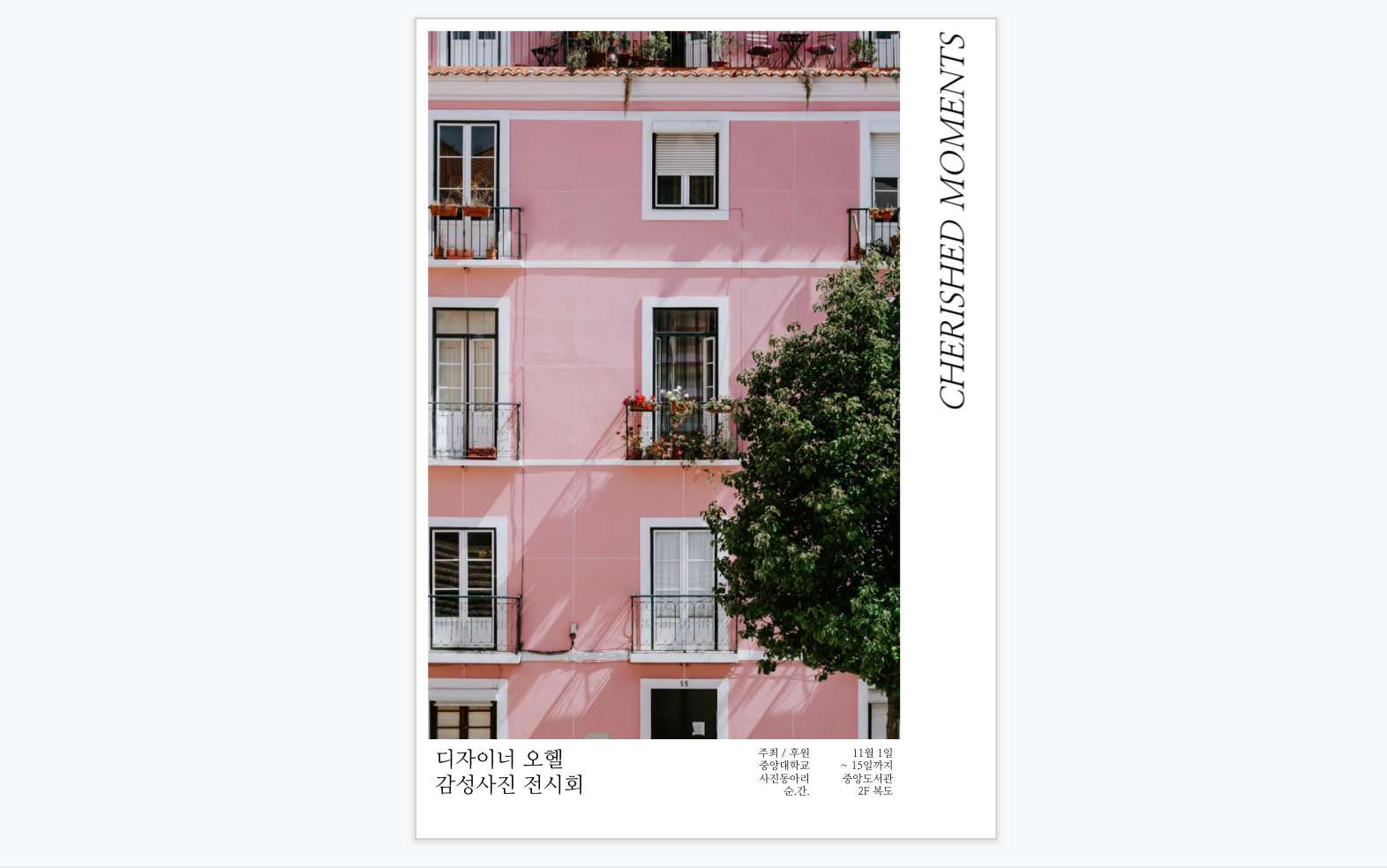 이번 작업은 예쁜 사진이 있길래 한 번 텍스트를 여기 저기 넣어 보고, 여러 가지 폰트로 느낌을 테스트해 보면서 직접 디자인해본 양식이라 끝내고 나니 더더욱 뿌듯했어요. 자신의 강좌, 동아리, 발표회, 전시회 등을 홍보하실 때 텍스트만 바꿔 넣으시면 되니 여러 가지로 활용해 보시면 좋겠습니다. 이상 오헬이었습니다!