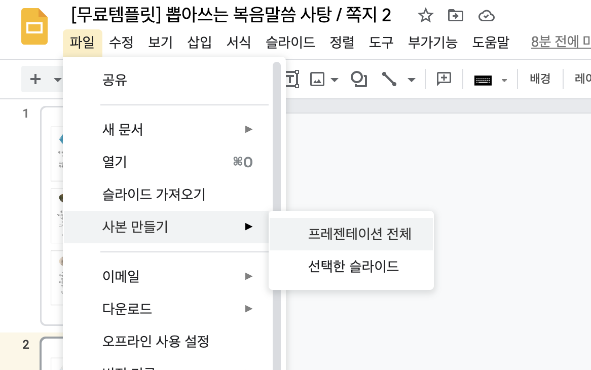 ➋ 파일(File) > 사본 만들기(Make a copy) 버튼을 누르시면 본인의 파일이 별도로 하나 생성됩니다.