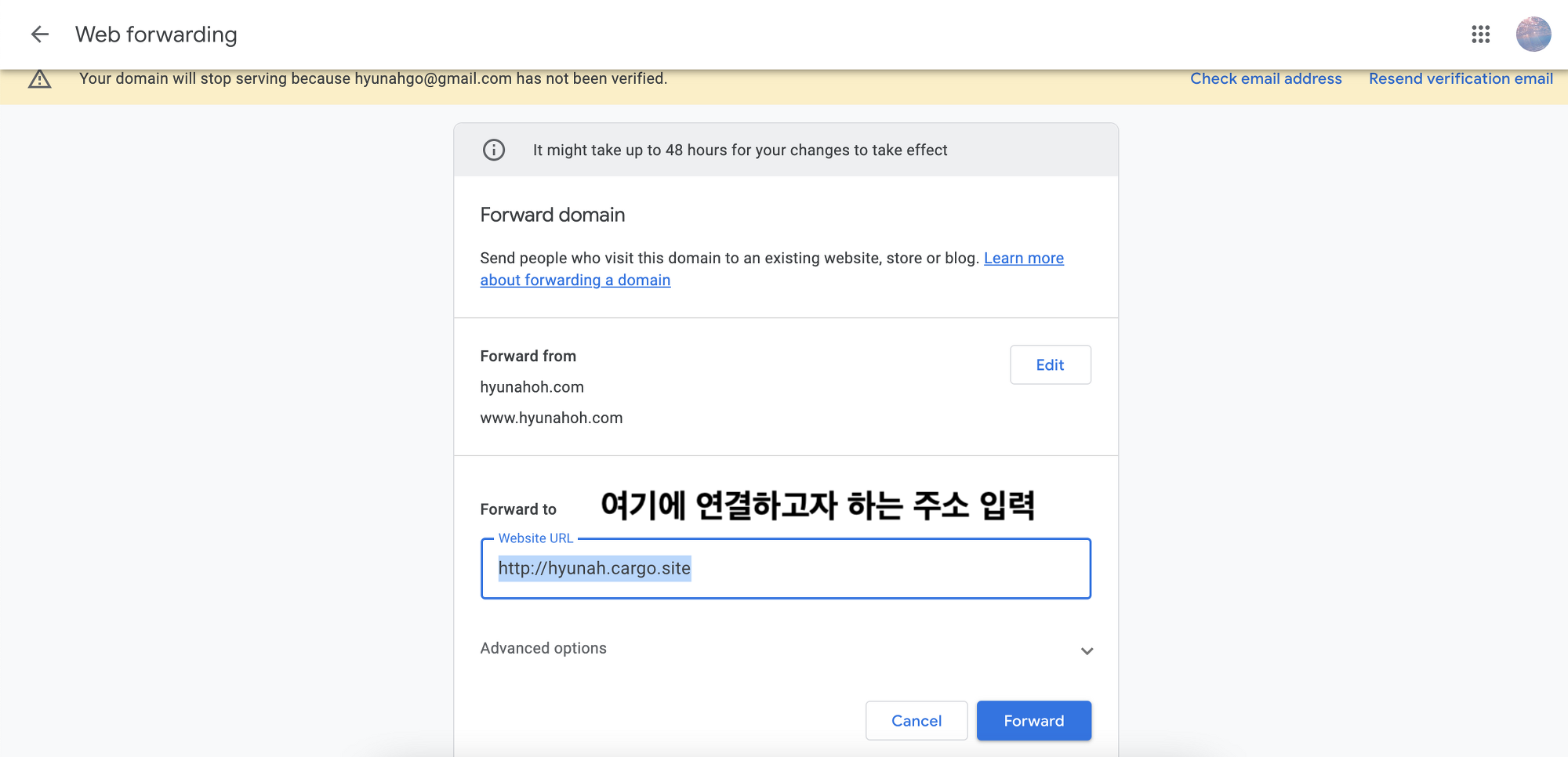 결제가 완료되면, 기존에 길고 지저분한(?) 주소를 가지고 있던 웹사이트에 연결을 시켜야 합니다. 그래야 새로 구매한 내이름.com을 누르면 기존 웹사이트로 가게 되는거니까요. 웹사이트의 '얼굴'인 주소를 새로 만들어준다고 생각하시면 됩니다. 연결을 한다고 해서 기존에 쓰던 URL(예: hyunah.myportfolio.com)이 없어지는 건 아닙니다. 그냥 더 짧은 주소*를 하나 추가한다고 보시면 되어요.