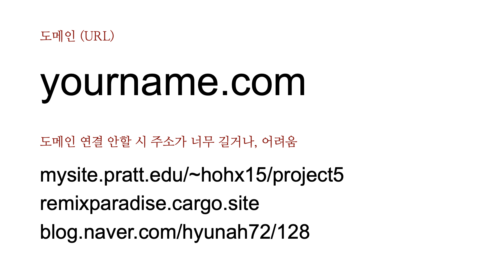예를 들어, 본인이 무료/유료 웹사이트 서비스, 예를 들어 cargo(카고), wix(윅스), squarespace(스퀘어스페이스), adobe portfolio(어도비 포트폴리오), wordpress(워드프레스) 등을 통해서 웹사이트를 만들면 도메인이 아래와 같이 너무 길고 복잡해집니다. 한 번 잊어버리면 다시 떠올리기도 힘들고, 이력서에 넣기에도 줄이 길어져서 자리를 많이 차지하게 됩니다.