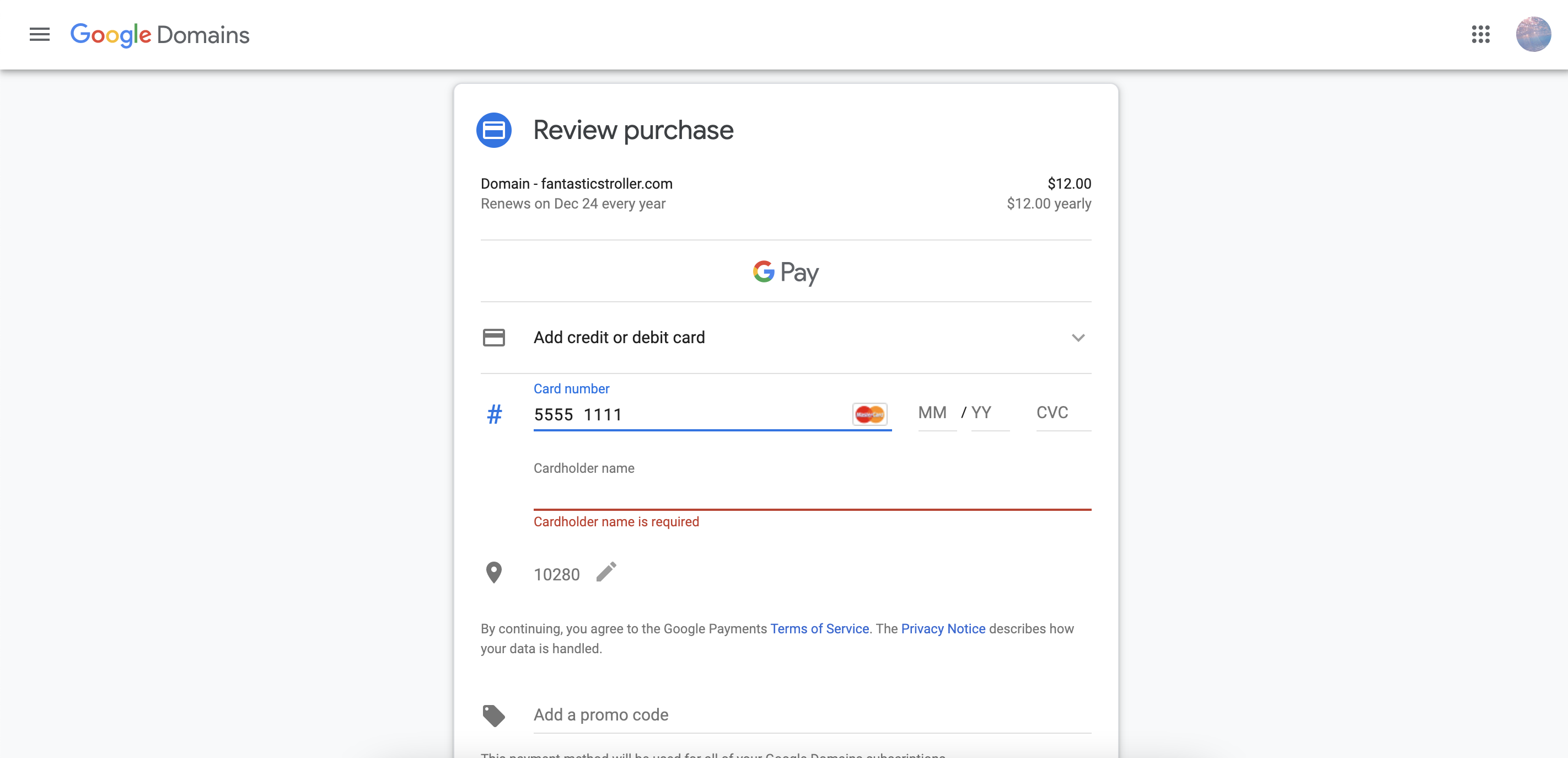 이건 무지 쉽습니다. 결제하기 버튼 누르고, 주소와 신용카드 정보 입력해주세요. 구글 도메인 같은 경우, 유튜브에서 영화 1편 결제할 때랑 UI가 똑같아서 익숙합니다.