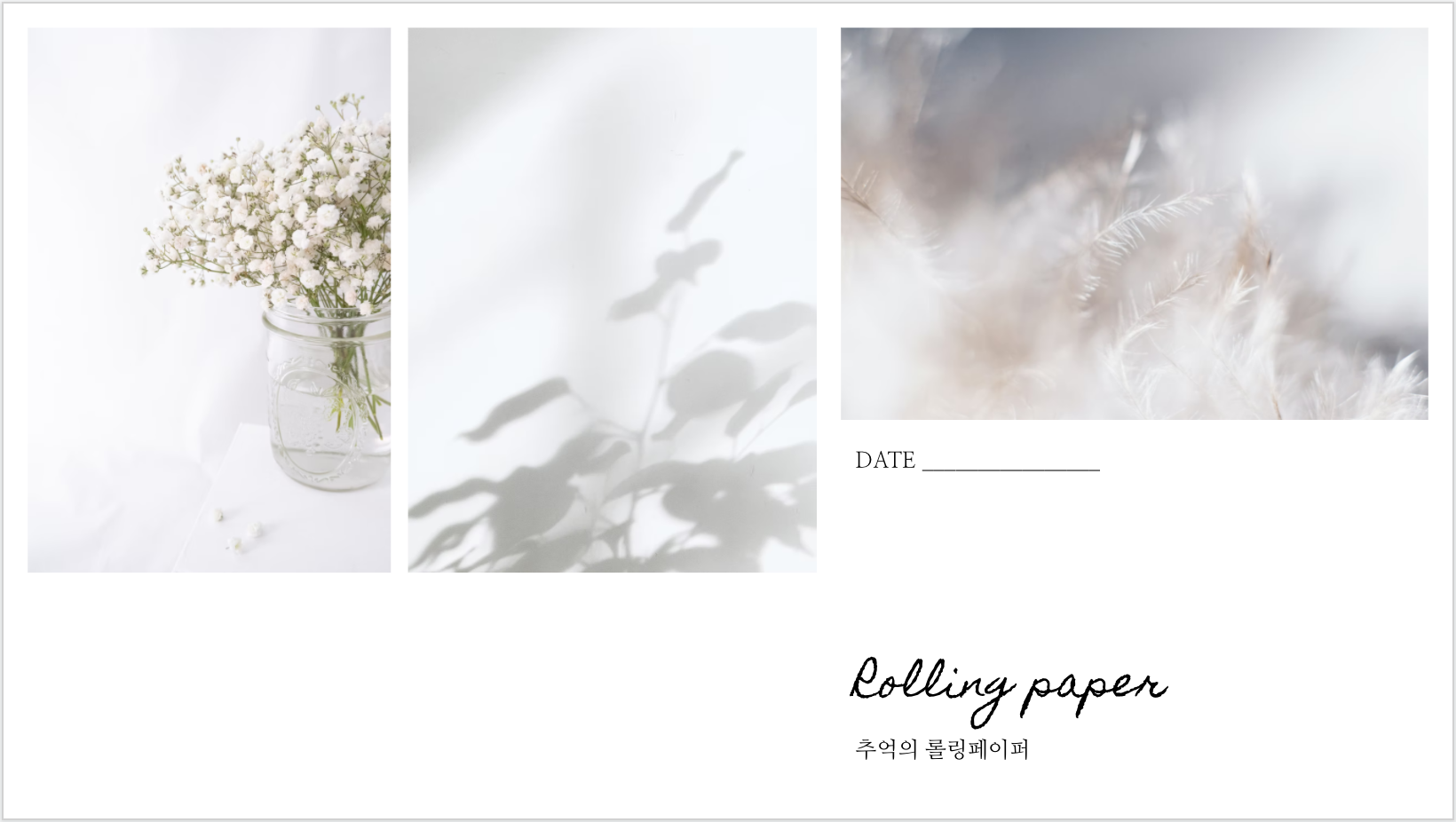 오늘은 천만년만에 롤링페이퍼 양식을 디자인해 보았습니다. 화이트플라워 사진들을 이용하여 고급스럽고 여성스럽고, 세련된 이미지의 롤링페이퍼에요. 감성적인 느낌을 내고 싶을 때 좋을 것 같습니다. 온라인수업 종강, 송년회나 망년회, 친목모임, 동호회에서 사용하시기 좋은 양식입니다. 인쇄해서 사용하시면 좋고, 온라인으로 사용하셔도 무방합니다. PDF파일과 함께 구글슬라이드 원본 링크가 있으니 온라인으로 사용하실 분들은 파일 > 사본만들기를 통해 복사 떠서 사용하시면 됩니다.