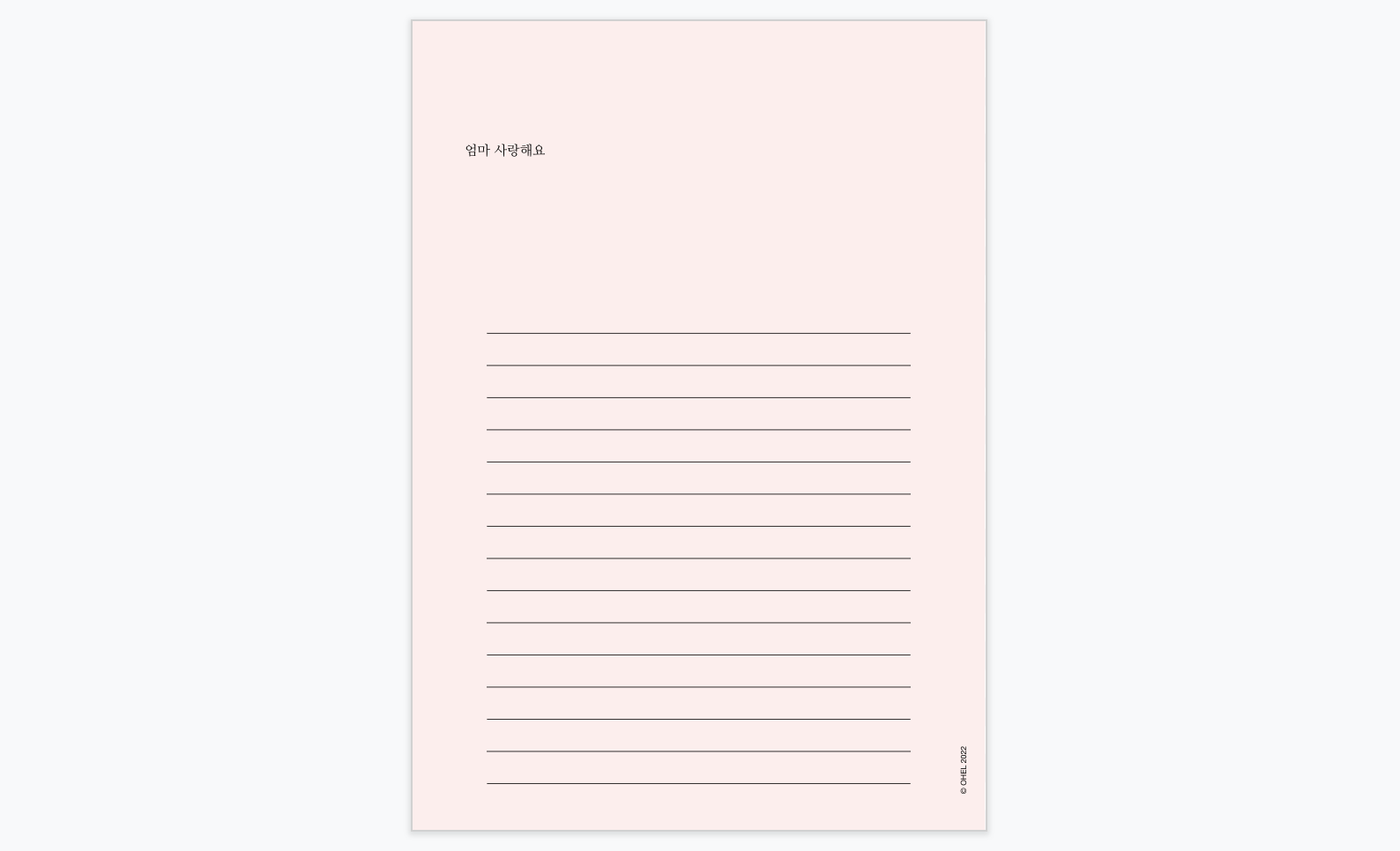 사이즈는 A4용지(210 x 297mm)로 작성되었습니다. 편하게 1장씩 뽑아 쓰시기 좋습니다. 인쇄 퀄리티를 위해서 남은 잉크의 양을 확인하시고, 편지지는 잉크를 많이 채운 상태에서 고품질로 (양면) 인쇄해 주시면 더욱 좋습니다.