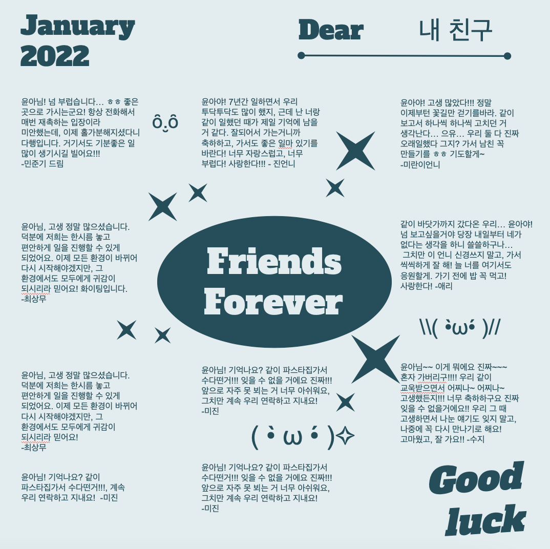 - 친구들끼리 속마음을 전할 때, 종강, 졸업식, 크리스마스, 연말연시, 생일축하 파티에서 서로 마음을 전할 때