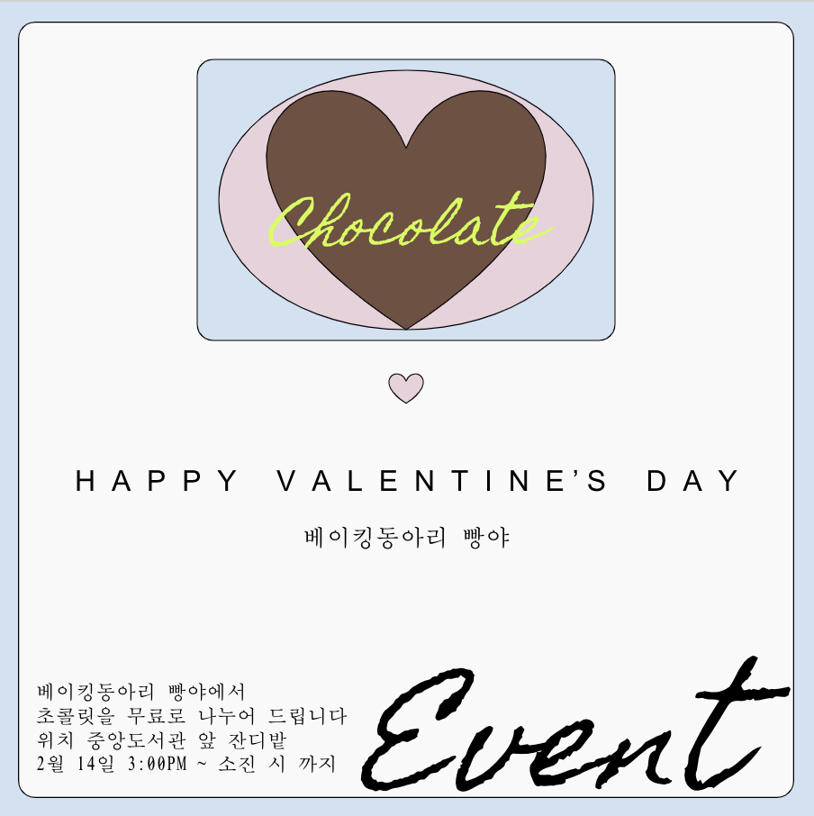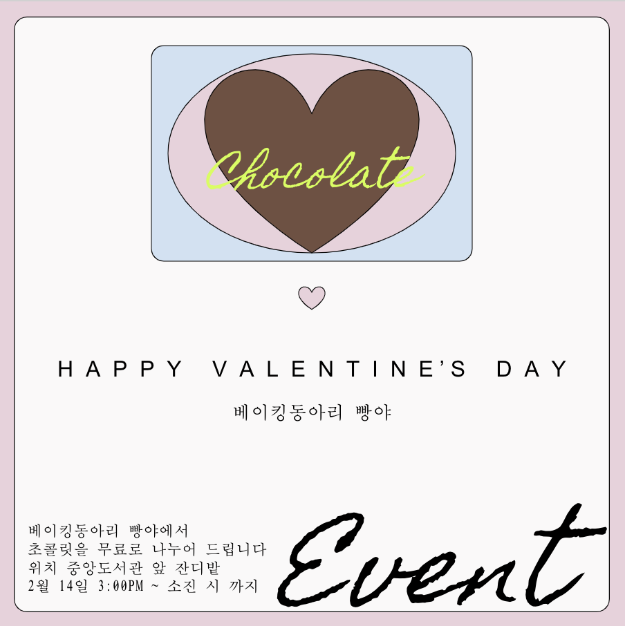 H A P P Y V A L E N T I N E ’ S D A Y Chocolate Event 베이킹동아리 빵야에서 초콜릿을 무료로 나누어 드립니다 위치 중앙도서관 앞 잔디밭 2월 14일 3:00PM ~ 소진 시 까지 베이킹동아리 빵야