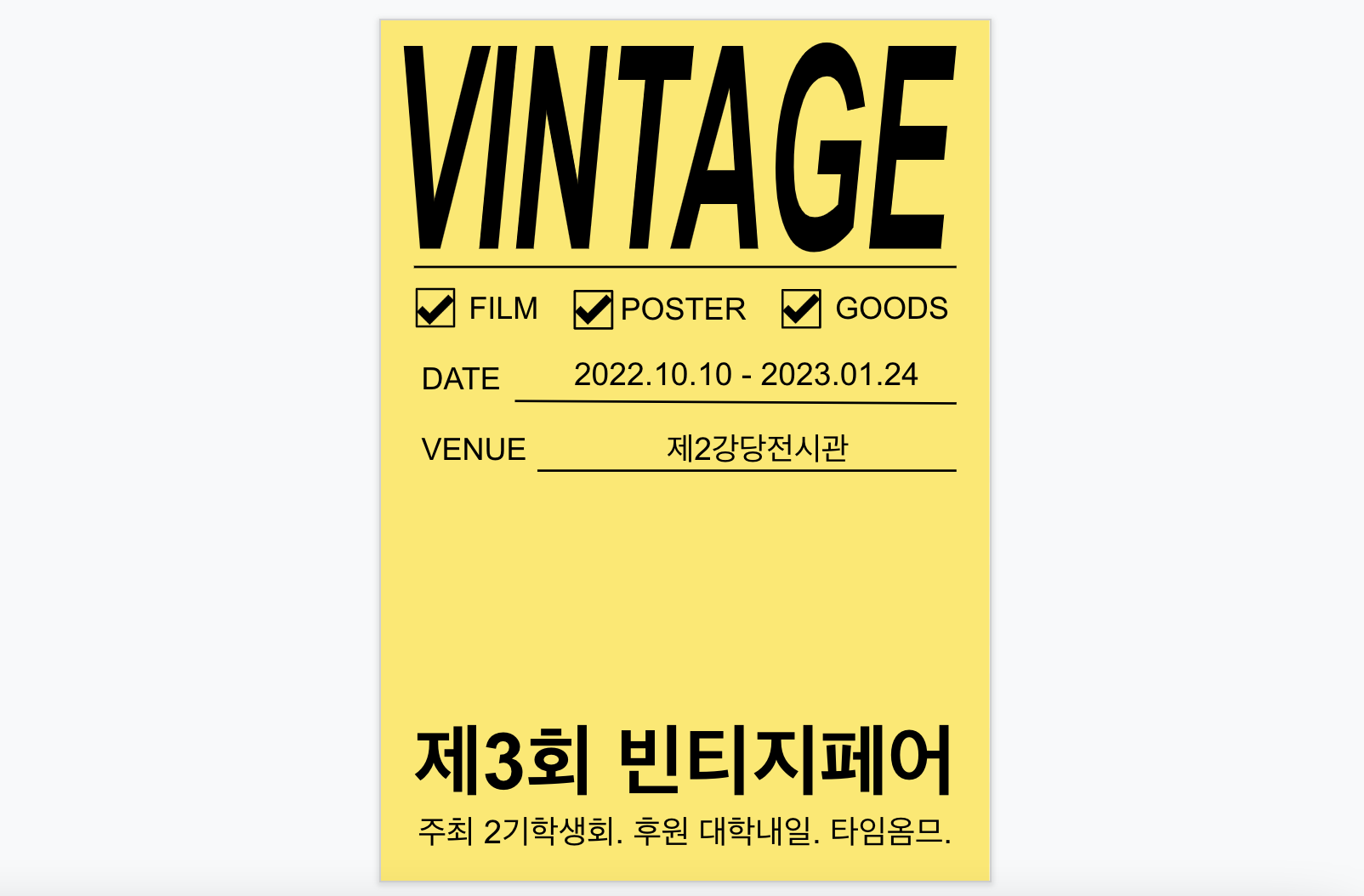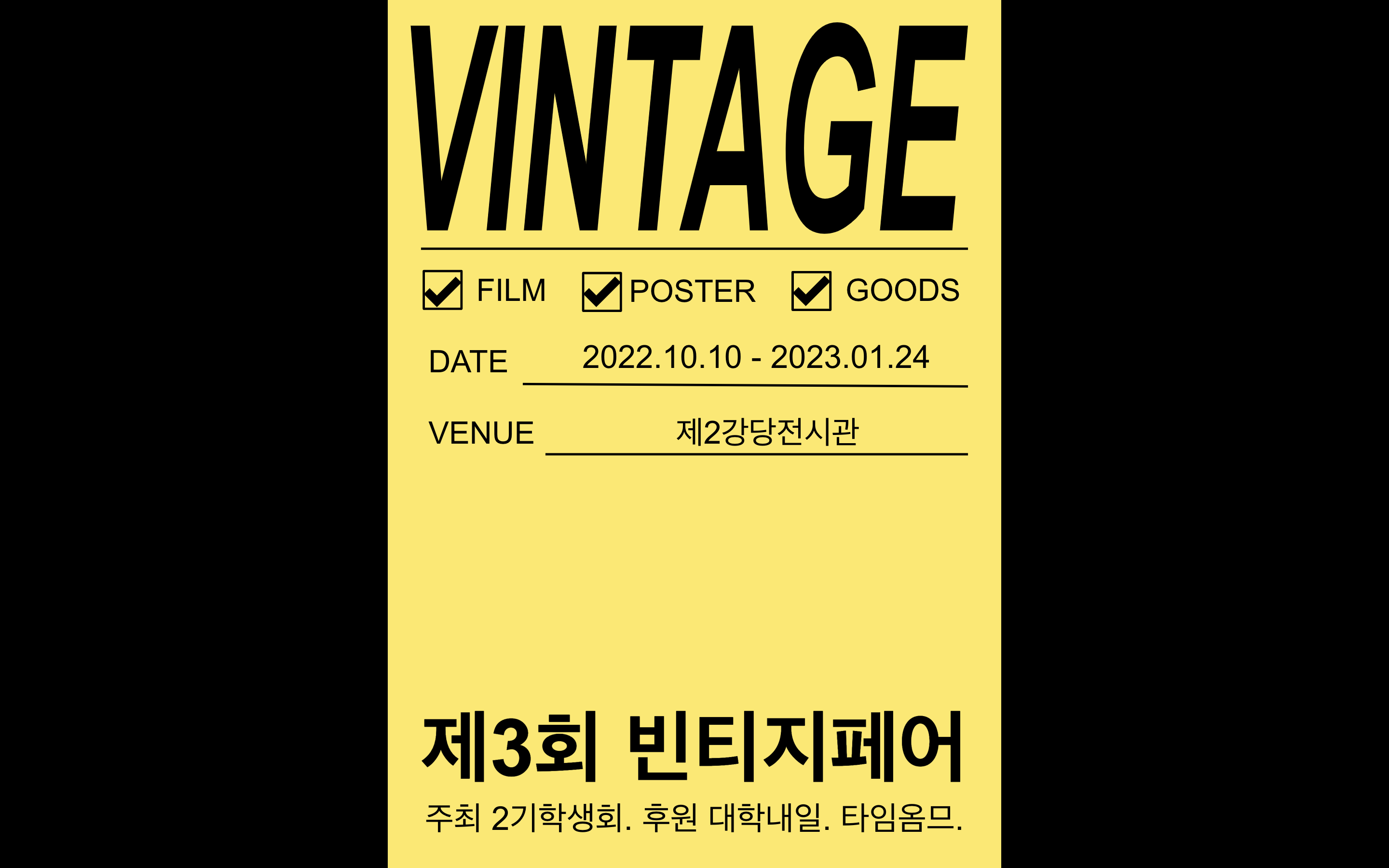 제2강당전시관 2022.10.10 - 2023.01.24 제3회 빈티지페어 주최 2기학생회. 후원 대학내일. 타임옴므. FILM POSTER GOODS DATE VENUE VINTAGE