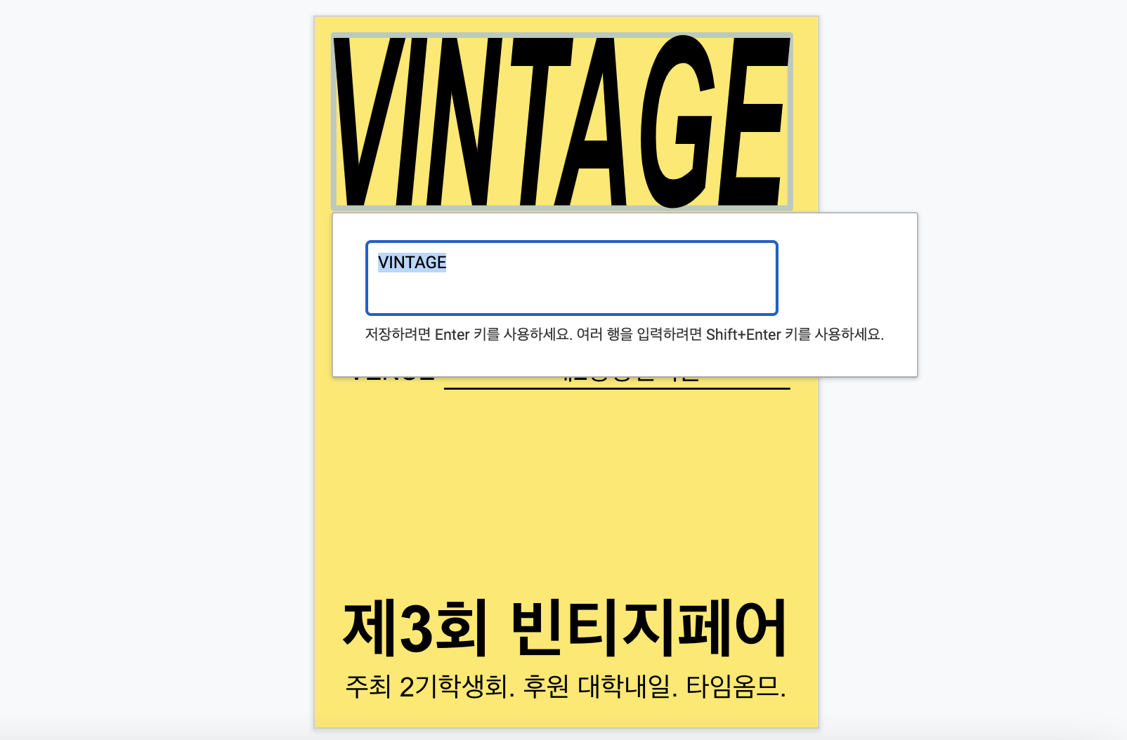 맨 위에 VINTAGE 라는 문구를 수정하시는 방법은 더블클릭 해서 문구를 바꾸어 주시면 됩니다. 그냥 일반 텍스트가 아닌, 구글슬라이드에서 제공하는 "워드아트 (WordArt)"라는 기능으로 일부러 쭉 늘린 글자입니다.