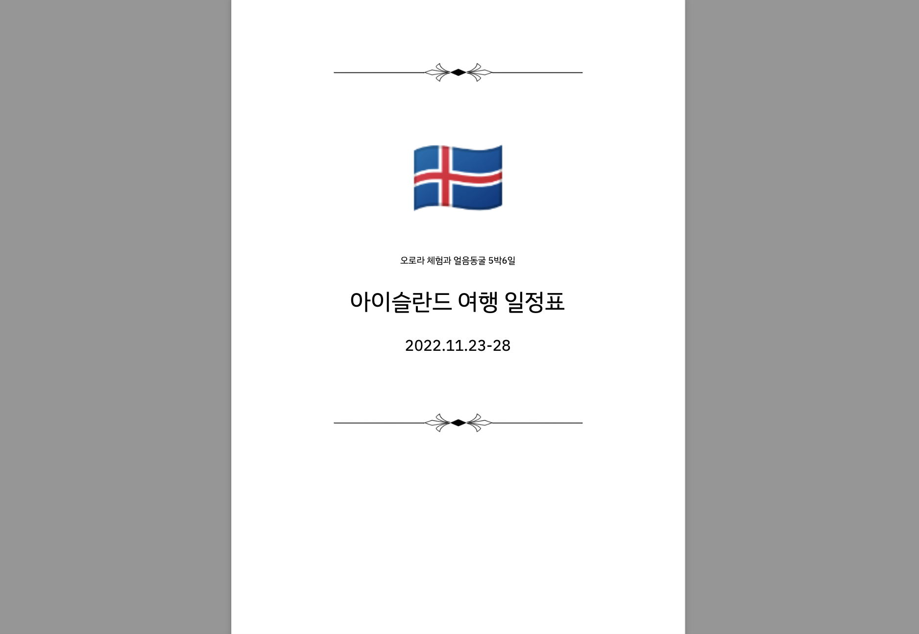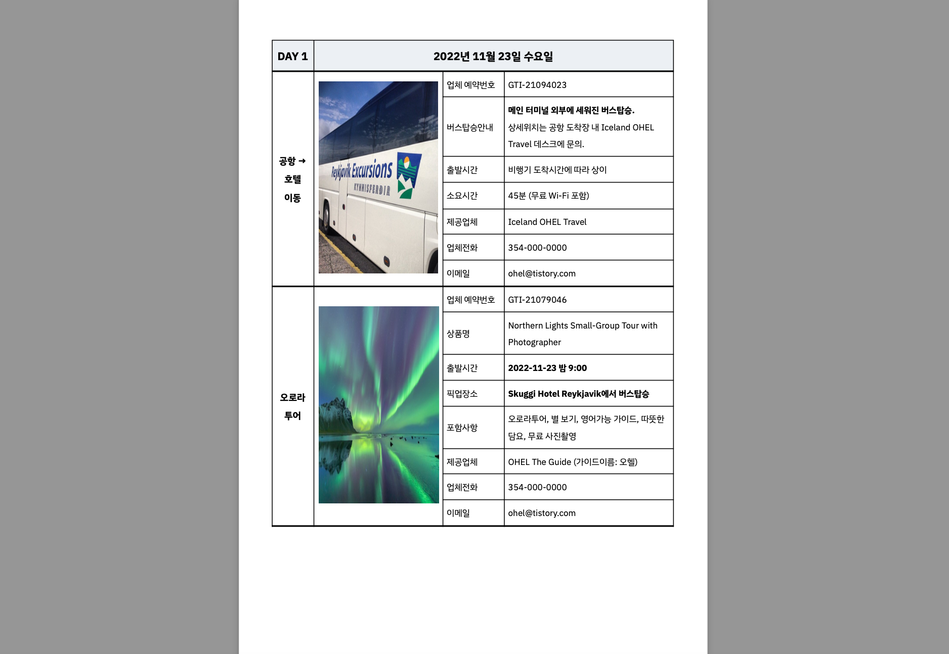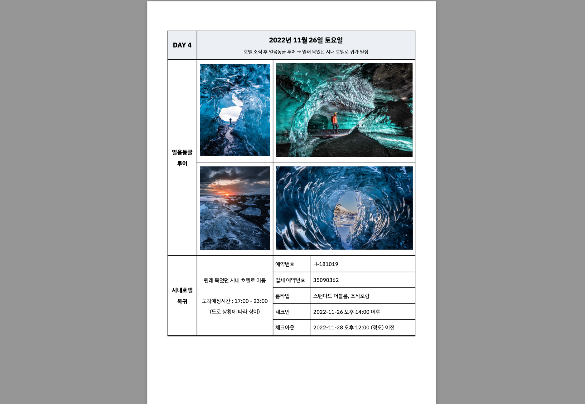 🇮🇸 오로라 체험과 얼음동굴 5박6일 아이슬란드 여행 일정표 2022.11.23-28 예약정보 | 패키지 안내 패키지 정보 예약자명 오헬렌 (Helen Oh) 예약번호 T-546262 (여행객 : 2명) 여행일정 2022-11-23 오전 9:3
