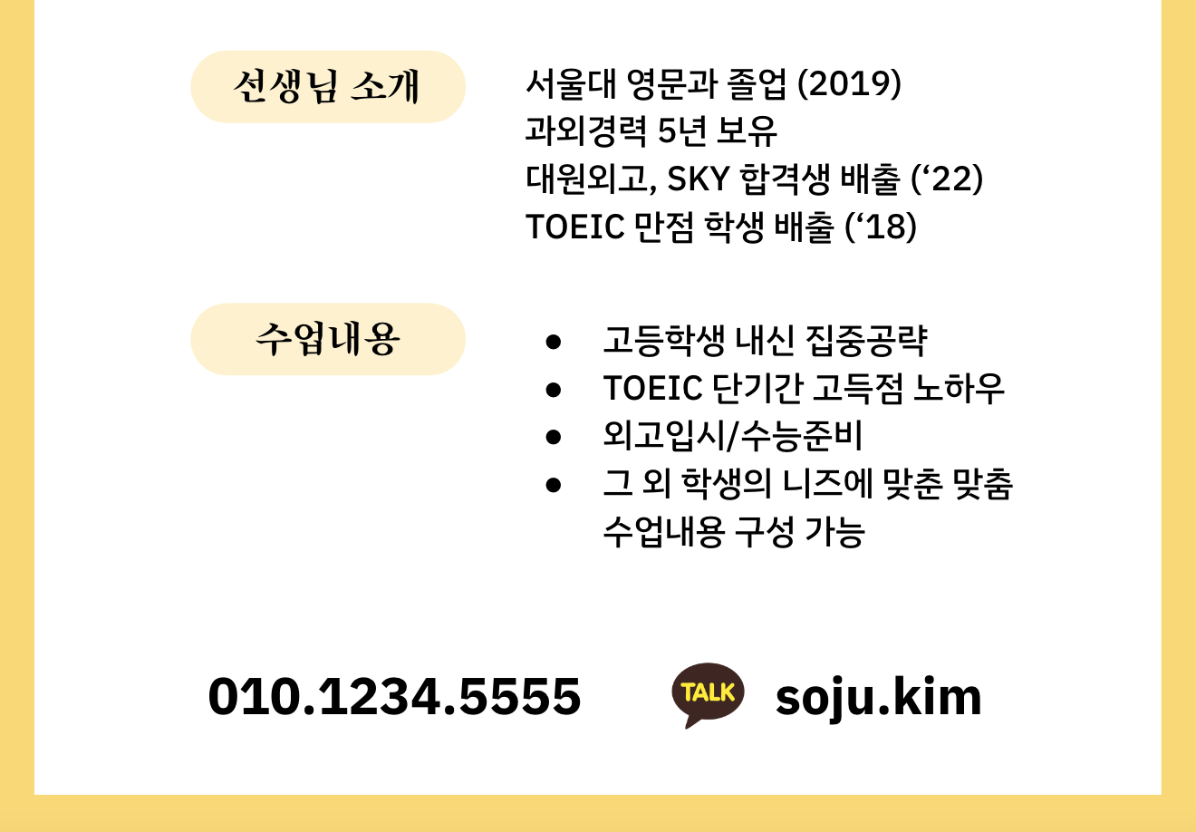 해당 무료 템플릿은 제가 직접 구글닥과 구글 제공 기본 폰트를 사용하여 만들었습니다. 표와 레이아웃은 순수하게 제가 구성한 저의 창작물입니다. 전화번호와 카카오톡 아이디, 선생님 이력 등은 제가 모두 허구로 지어낸 내용입니다.