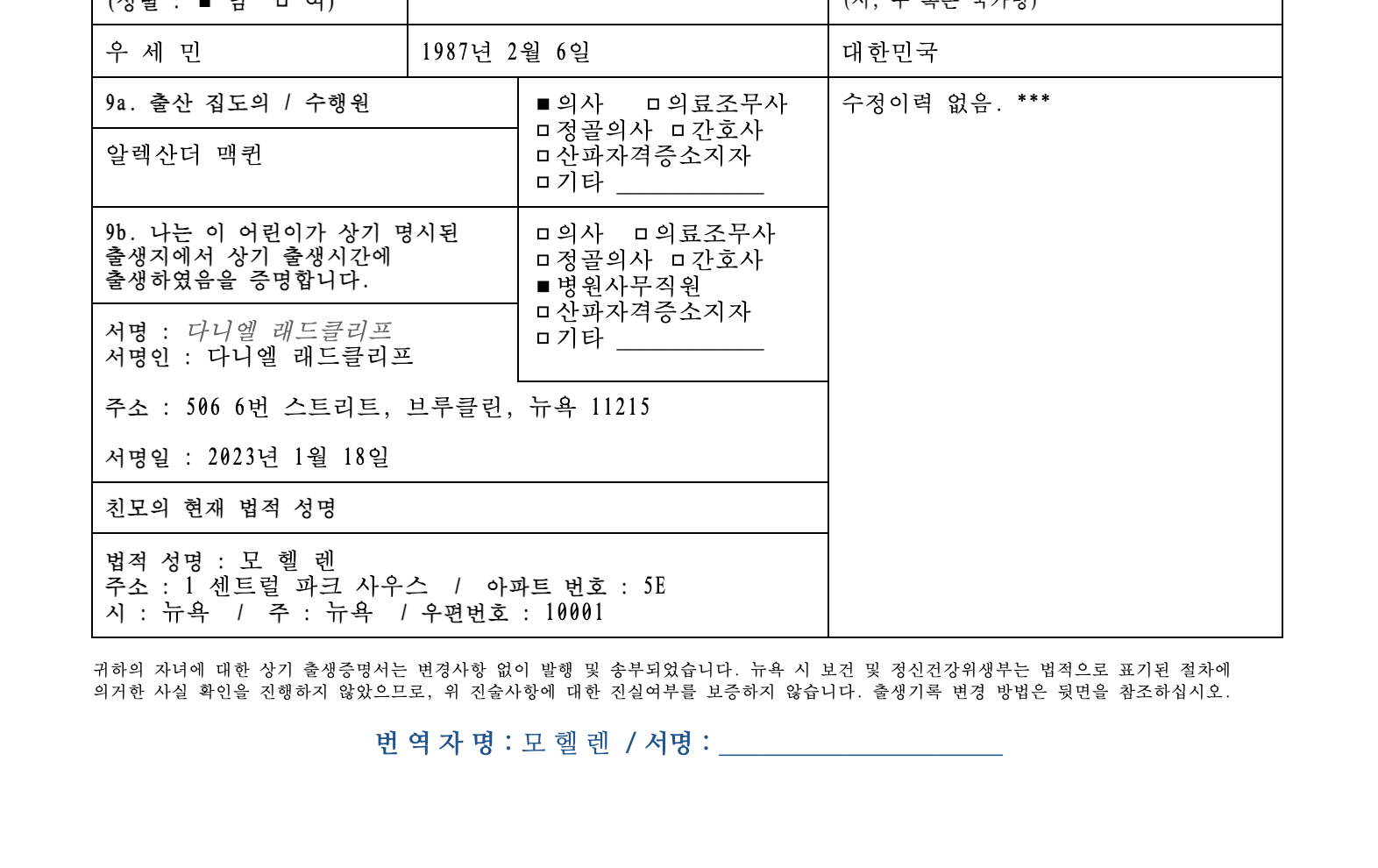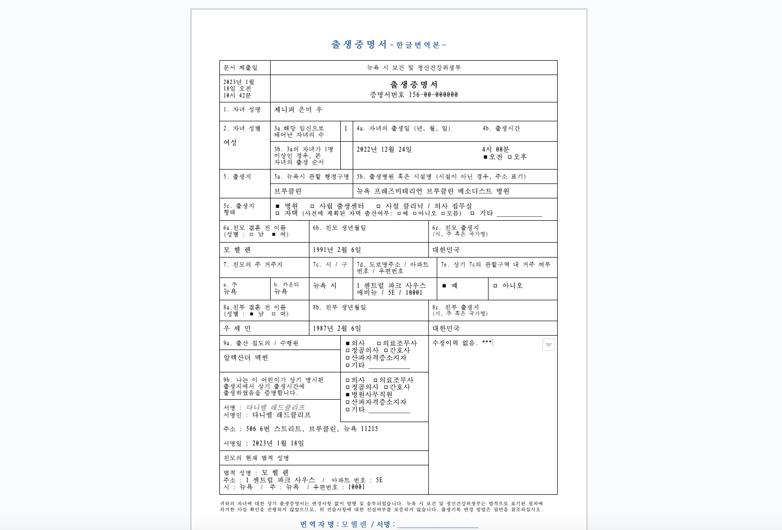 출 생 증 명 서 - 한 글 번 역 본 - 문서 제출일 뉴욕 시 보건 및 정신건강위생부 2023년 1월 18일 오전 10시 42분 출 생 증 명 서 증명서번호 156-00-000000 1. 자녀 성명 제니퍼 은미 우 2. 자녀 성별 여성 3