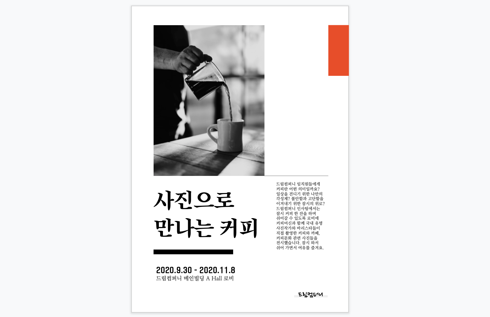 사진으로 만나는 커피 2020.9.30 - 2020.11.8 드림컴퍼니 메인빌딩 A Hall 로비 드림컴퍼니 임직원들에게 커피란 어떤 의미일까요? 일상을 견디기 위한 나만의 각성제? 불안함과 고단함을 이겨내기 위��