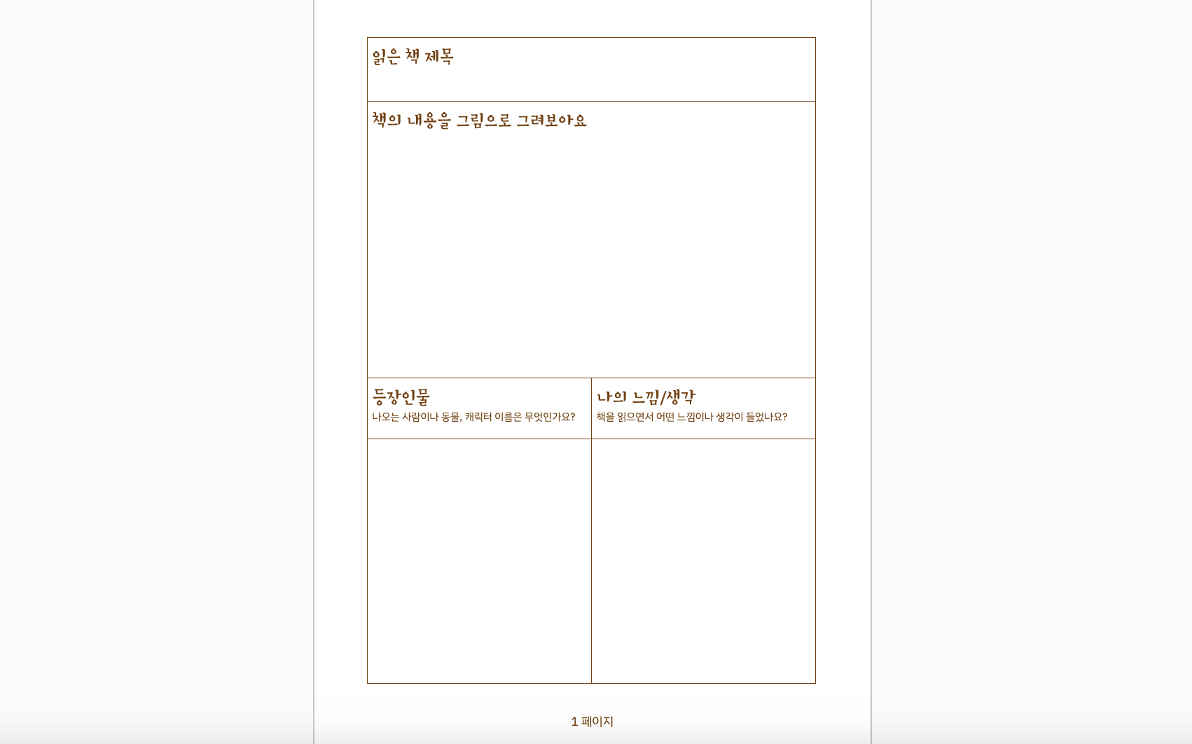 다음 페이지부터는 독후감용 페이지들이 이어집니다. 아래로 내려가시면 10페이지짜리로 제가 미리 만들어 놓은 PDF가 있는데요, 그대로 A4용지에 인쇄하여 쓰셔도 됩니다.
