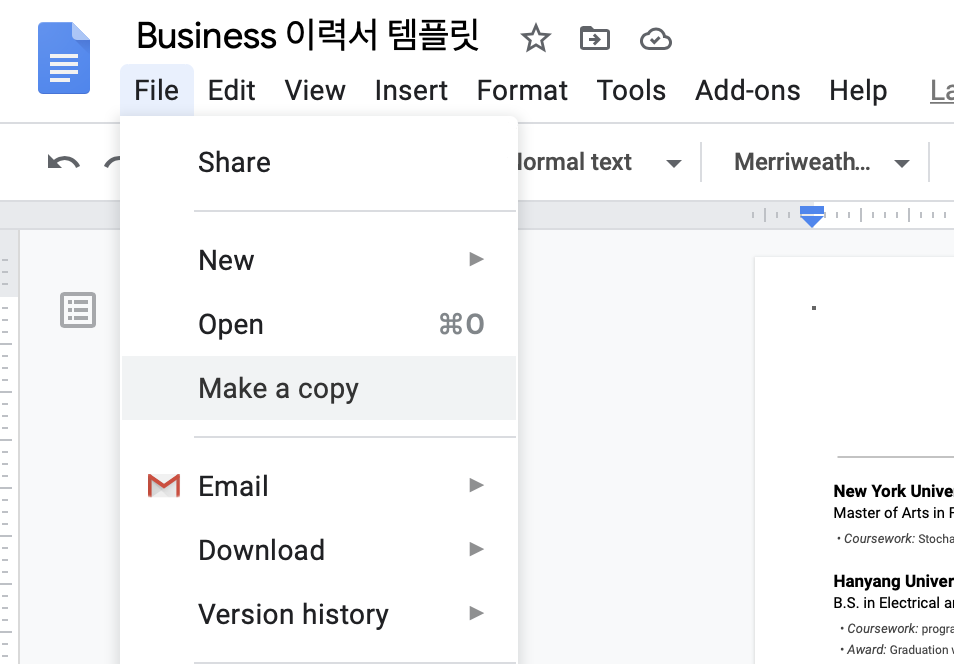 ➋ 파일(File) > 복사본 만들기(Make a copy) 버튼을 누르시면 본인의 파일이 별도로 하나 생성되어, 자유롭게 편집하실 수 있습니다.