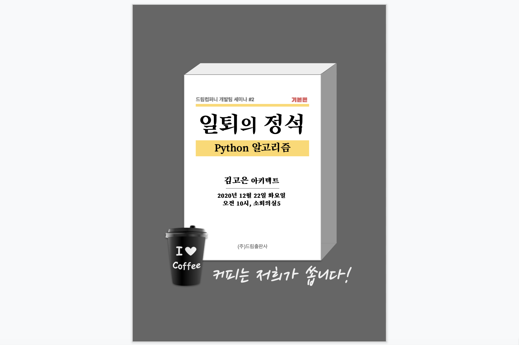 일퇴의 정석 드림컴퍼니 개발팀 세미나 #2 Python 알고리즘 기본편 김고은 아키텍트 2020년 12월 22일 화요일 오전 10시, 소회의실5 커피는 저희가 쏩니다! (주)드림출판사