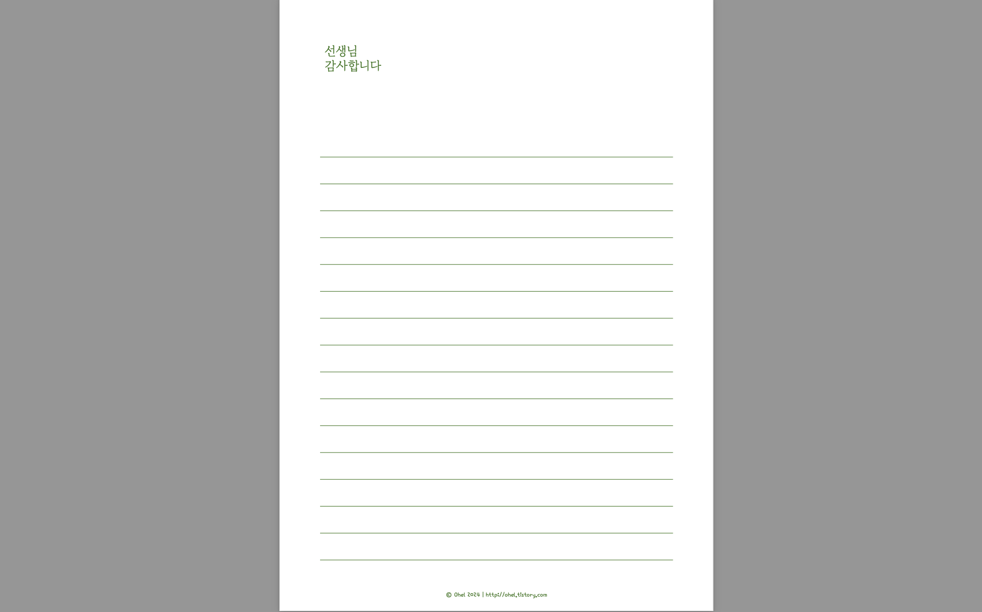 사이즈는 A4용지(210 x 297mm)로 작성되었습니다. 편하게 1장씩 뽑아 쓰시기 좋습니다. 인쇄 퀄리티를 위해서 남은 잉크의 양을 확인하시고, 편지지는 잉크를 많이 채운 상태에서 고품질로 (1페이지만 양면) 인쇄해 주시면 더욱 좋습니다.