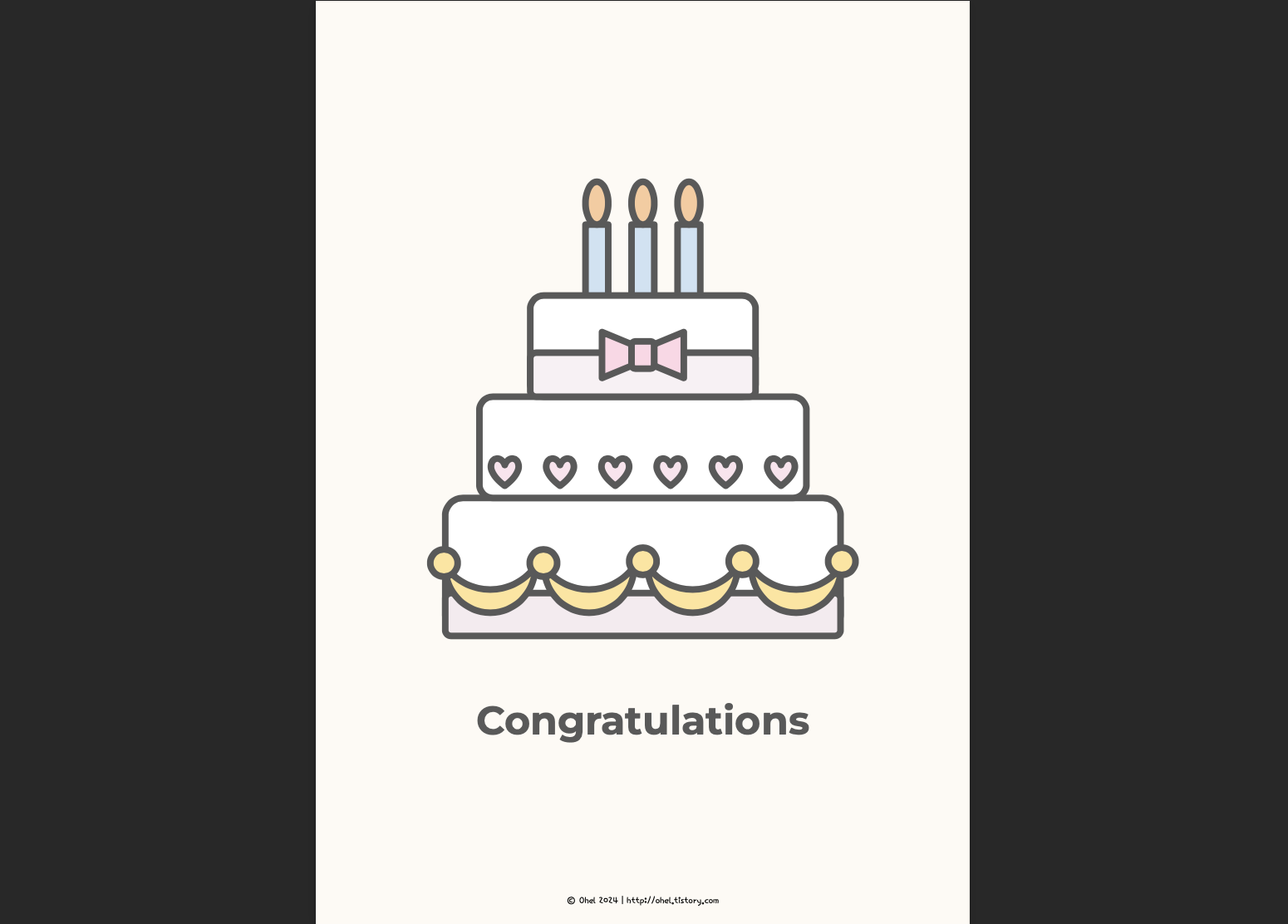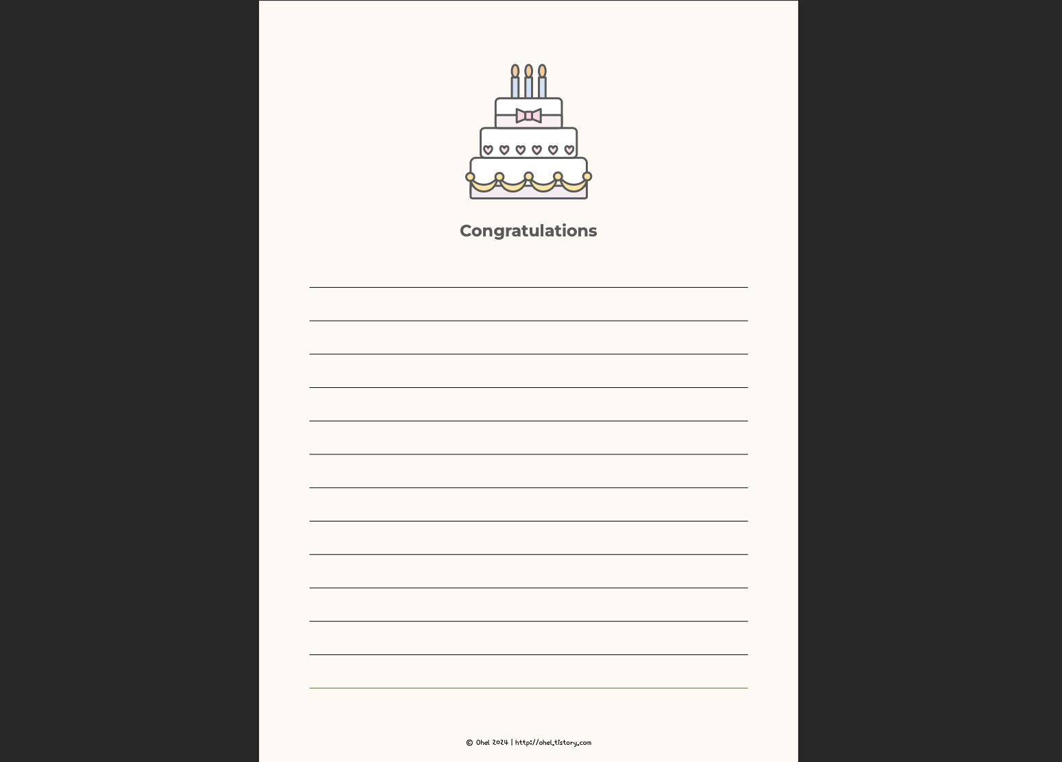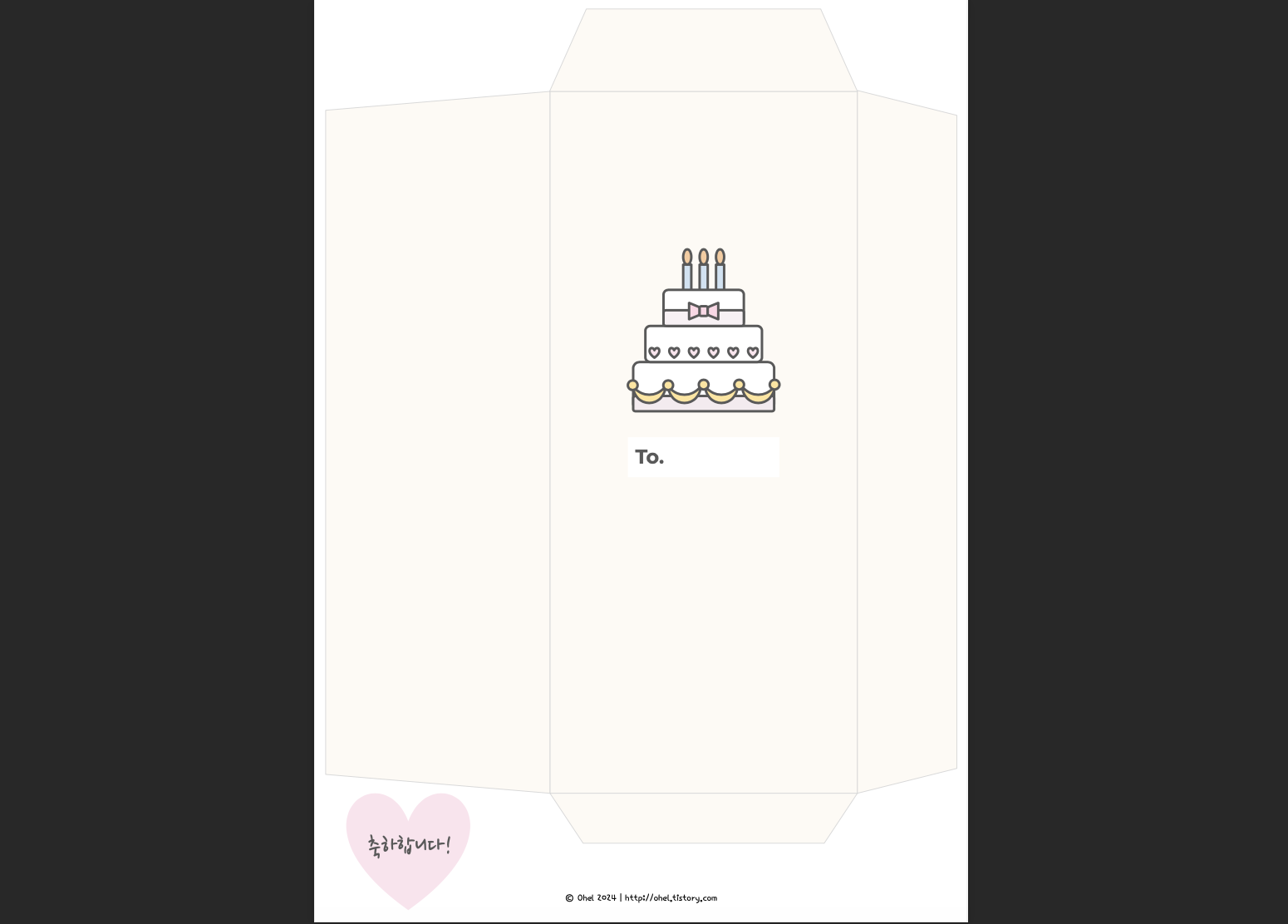 오늘은 구글슬라이드로 생일, 입학, 졸업, 취업, 임신, 출산, 회복 등 1년 중 어느때라도 쓰기 어색하지 않은 케이크 디자인의 축하용 편지지와 봉투를 디자인해보았습니다. 뽑아서 쓰기 좋은 구성으로 되어 있고, 손글씨에 자신이 없다면 온라인으로 작성하셔도 좋습니다. 인쇄하기 전에 컬러 프린터 용량을 꼭! 확인해주세요. 사용방법은 PDF 다운로드 후 1,2 페이지만 양면 인쇄하시면 됩니다. (앞 뒤가 따로 있습니다)