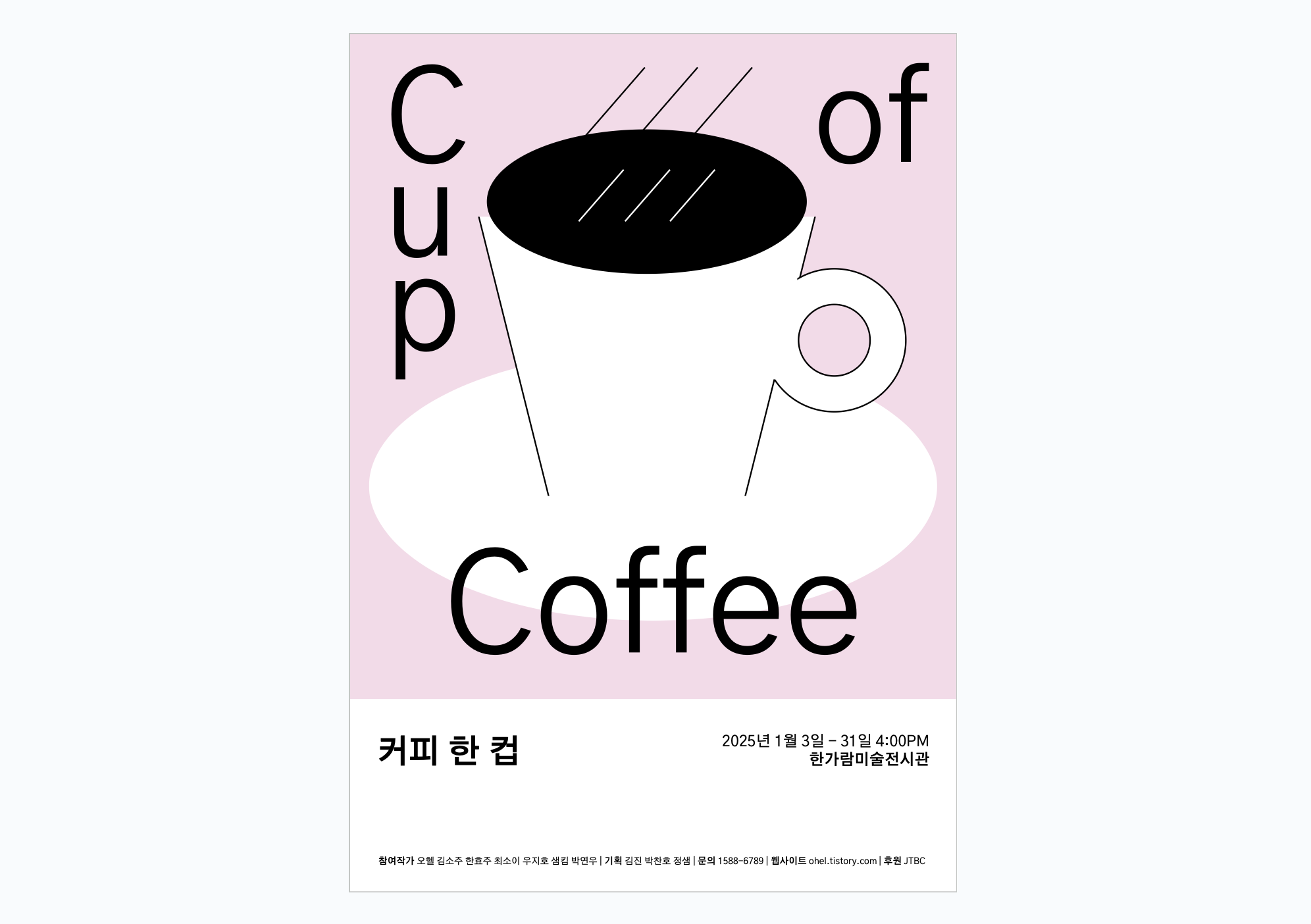 Cup of Coffee 커피 한 컵 2025년 1월 3일 - 31일 4:00PM 한가람미술전시관 참여작가 오헬 김소주 한효주 최소이 우지호 샘킴 박연우 | 기획 김진 박찬호 정샘 | 문의 1588-6789 | 웹사이트 ohel.tistory.com | 후원