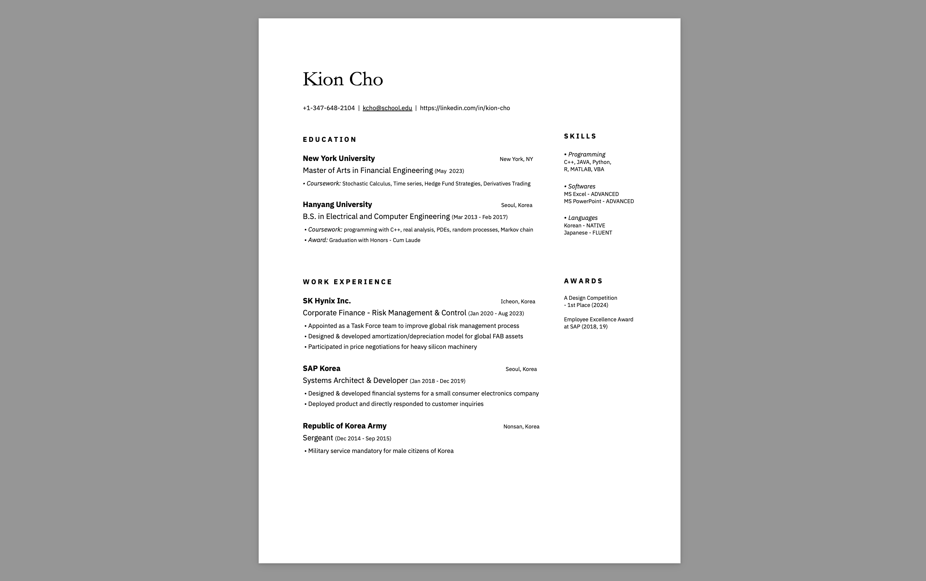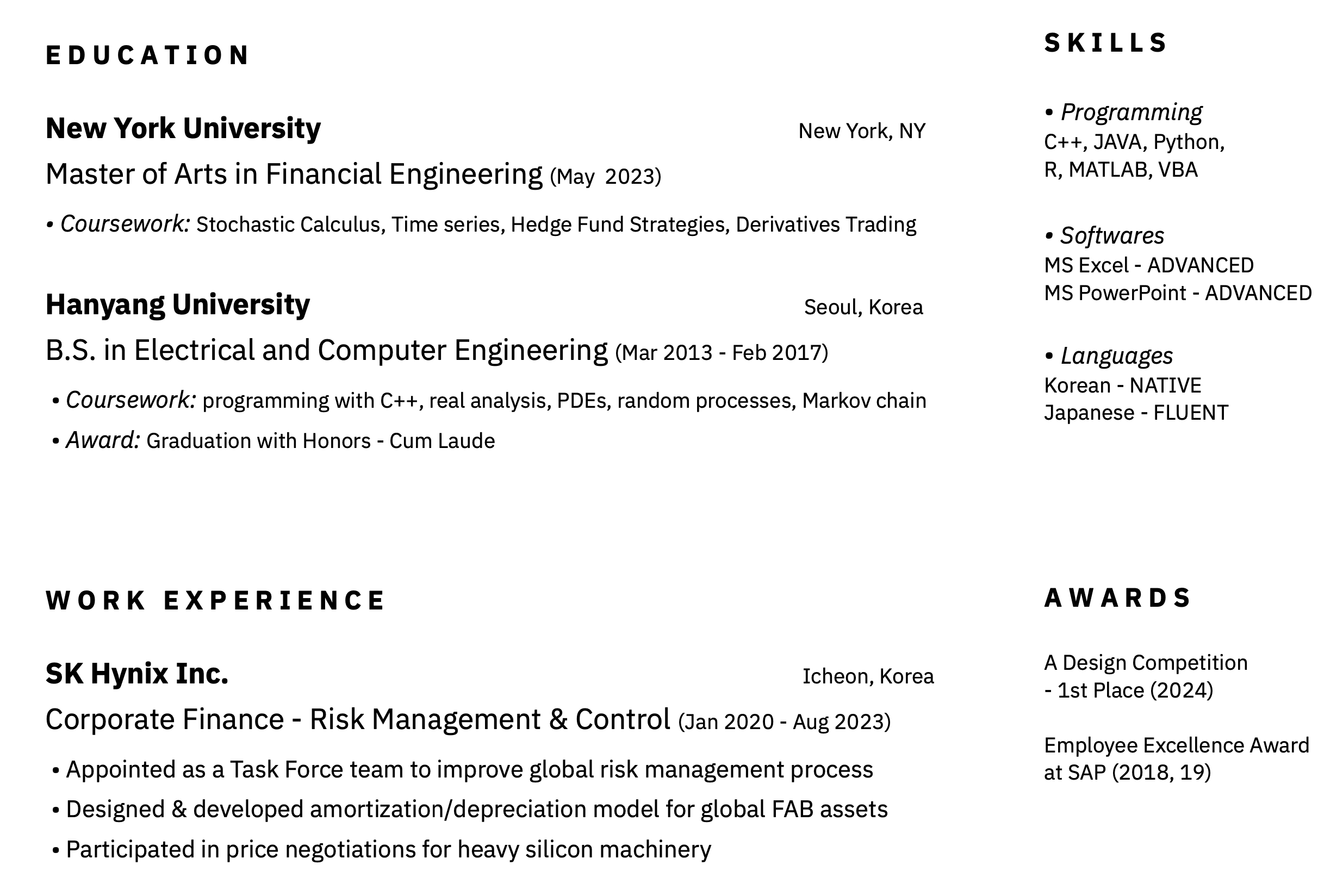 학력사항이 나오고, 그 다음 경력사항이 나오는데 순서는 본인이 자신 있는 부분에 따라 경력사항을 먼저 서술하고 학력사항을 서술하셔도 됩니다. Skills (자격사항) 와 Awards (수상내역) 부분에서는 되도록이면 직무와 관련성이 매우 높은 부분만을 간결하게 나열해주세요.