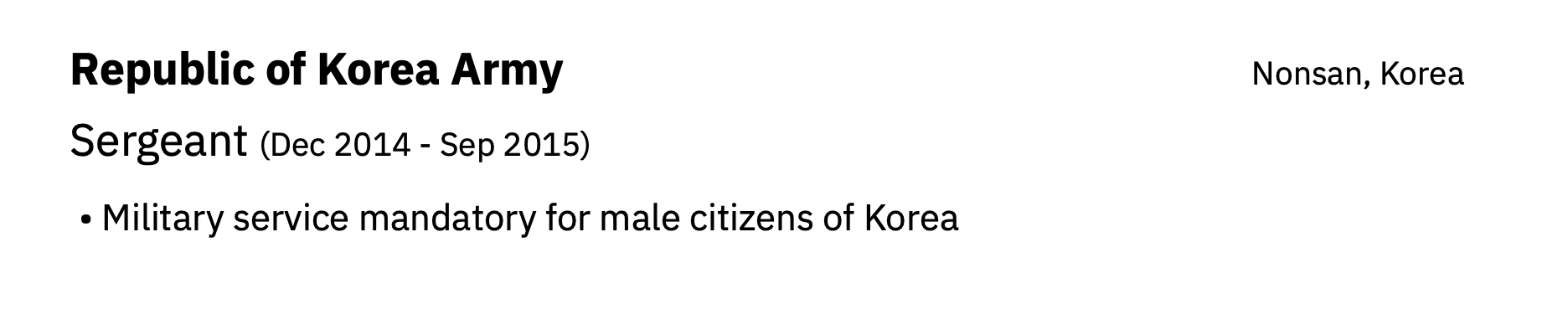 그리고 군대를 다녀오신 대한민국 국적의 남성분들께서는 커리어 공백을 설명할 수 있도록 군 복무사항 관련 내용도 넣어주시면 좋습니다. 엄격한 위계질서 하에 단체생활을 한 경험을 해외에서는 긍정적으로 볼 수 있으니까요.