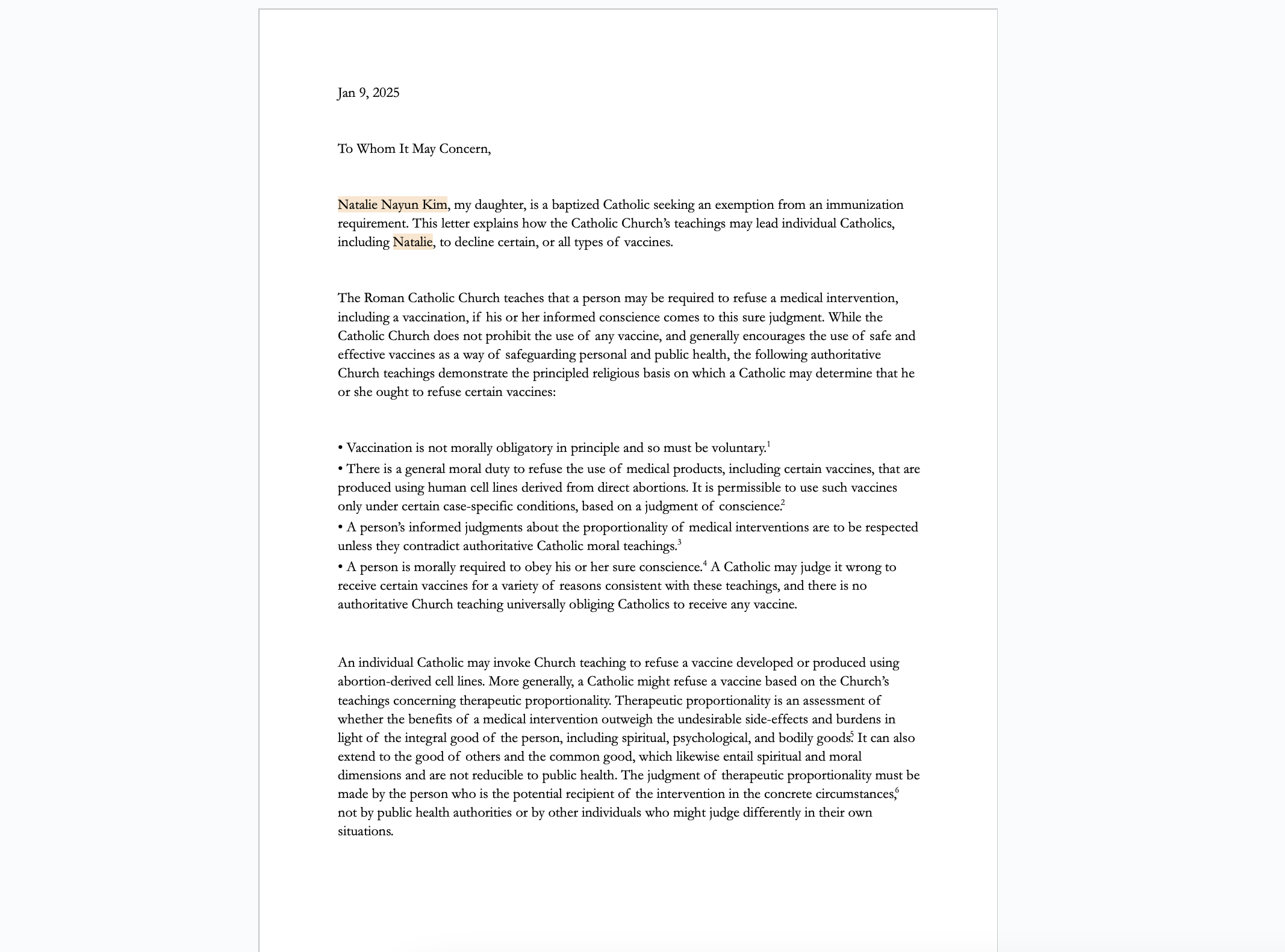 Jan 9, 2025 To Whom It May Concern, Natalie Nayun Kim, my daughter, is a baptized Catholic seeking an exemption from an immunization requirement. This letter explains how the Catholic Church’s teachings may lead individual Catholics, including Natalie, t