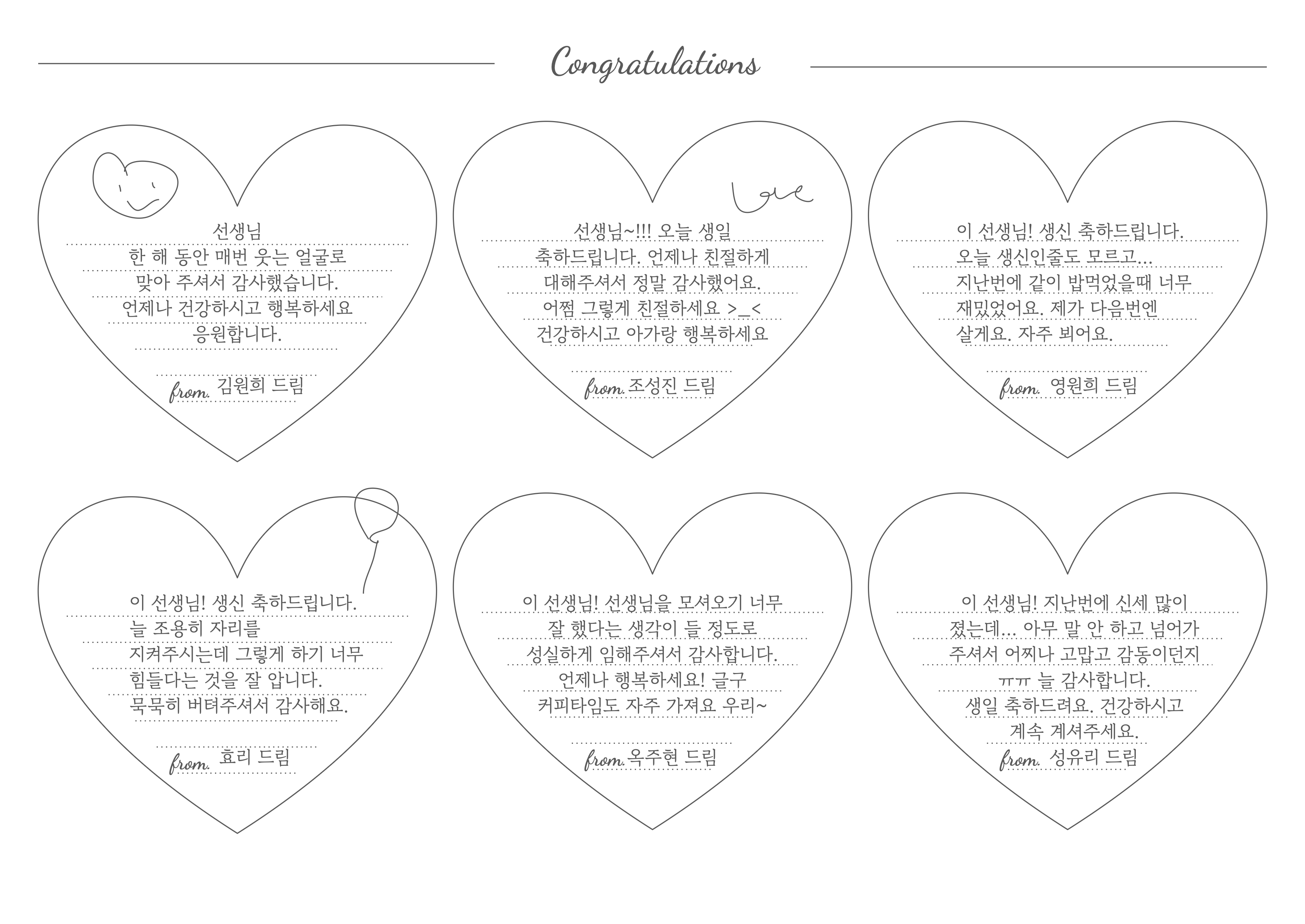 Congratulations from. from. from. from. from. from. 선생님 한 해 동안 매번 웃는 얼굴로 맞아 주셔서 감사했습니다. 언제나 건강하시고 행복하세요 응원합니다. 김원희 드림 선생님~!!! 오늘 생일 축하드립