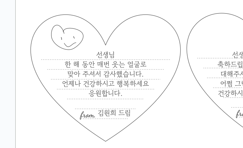 이번 심플하트 무료 롤링페이퍼 양식 도안은 구글슬라이드와 PDF 다운로드 포맷으로 동시에 제작되었기 때문에 디지털로도, 인쇄해서도 예쁘게 활용하실 수 있는 디자인이니 여러가지 축하할 일들에 (생일, 졸업, 스승의날, 진급, 이직, 퇴직, 새해인사 등등) 유용하게 사용하시면 좋겠습니다. 이상 오헬이었습니다.