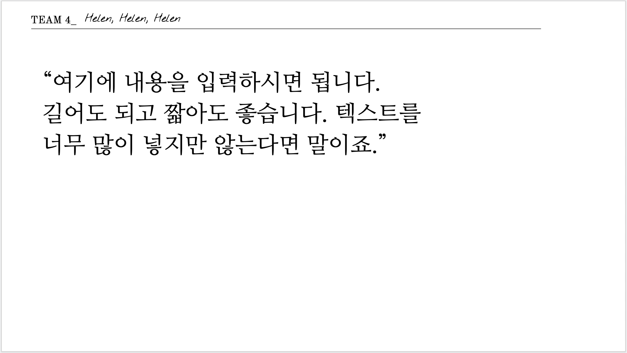 참고로, 이번 템플릿의 경우 전체적으로 팀원들의 이름이나 제작자의 이름을 넣는 칸을 슬라이드 맨 위에 배치하였으니, 이 점에 유의해서 발표하시기 전에 꼭! 해당내용에 이름이 잘 들어갔는지를 확인해 주세요.