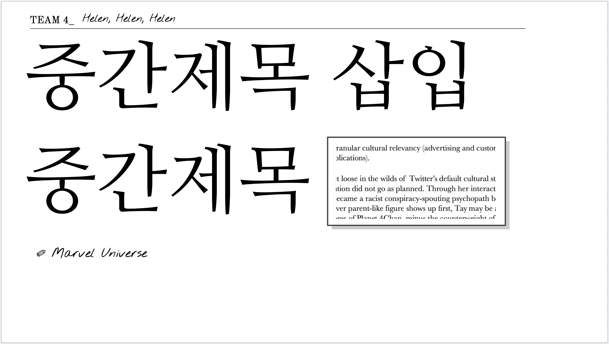 같은 파워포인트 테마를 한글 버전으로도 준비해 보았습니다. 한글 폰트로는 영문 글씨체와 최대한 비슷하게 네이버에서 제공한 나눔명조체를 사용하였고, 본문은 산세리프 느낌으로 구글에서 제공하는 기본 한글 폰트를 그대로 사용하였습니다.