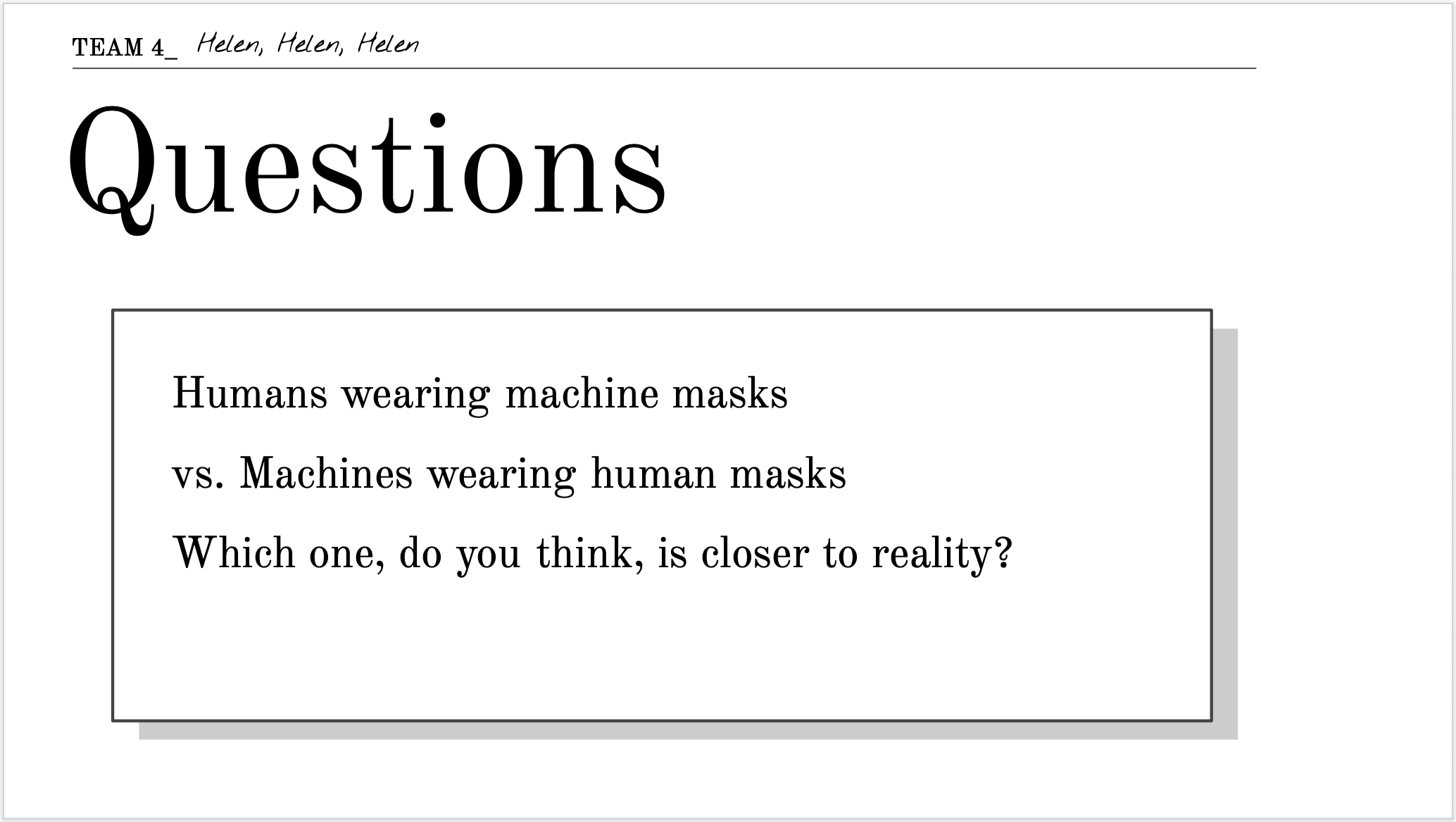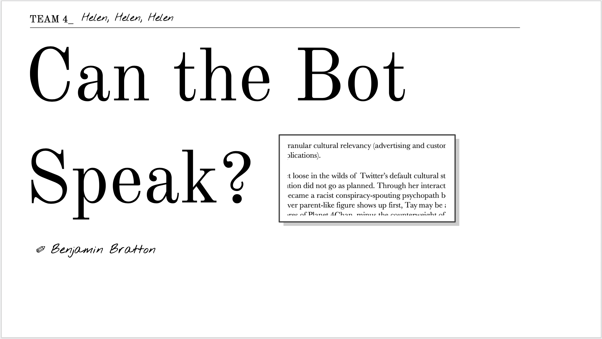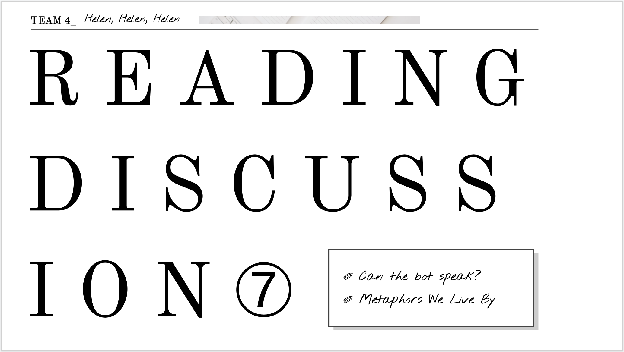 R E A D I N G D I S C U S S I O N ➆ ✐ Can the bot speak? ✐ Metaphors We Live By TEAM 4_ Helen, Helen, Helen