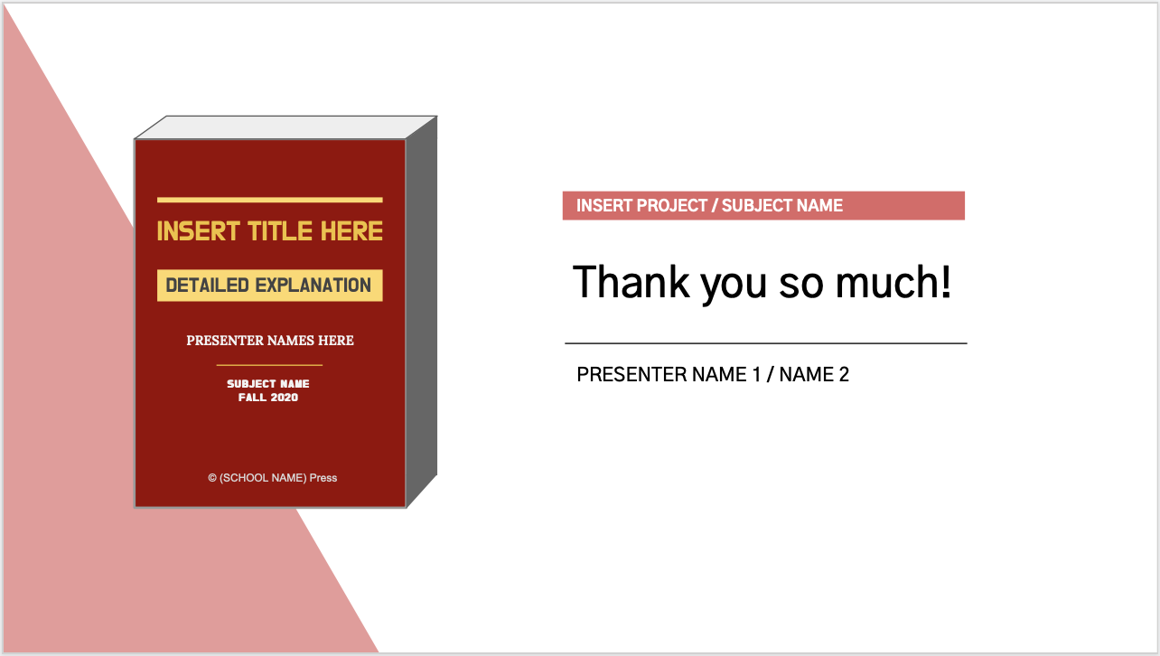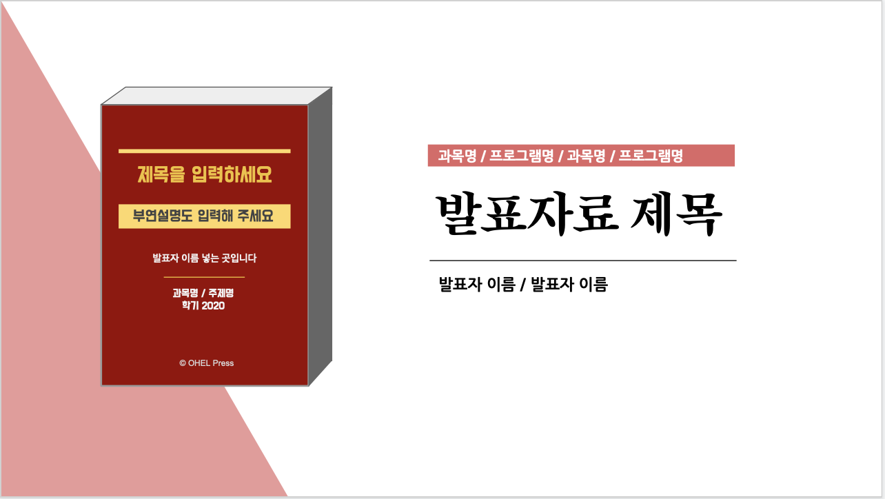 이번 템플릿의 경우, 제목 슬라이드에 있는 아래 하드커버북 내부의 내용도 채워 넣으셔서 쓰시면 더욱 귀엽게 연출하실 수 있습니다. 제목뿐 아니라, 마지막 슬라이드에도 반복해 주시는 것 꼭 잊지 마세요!