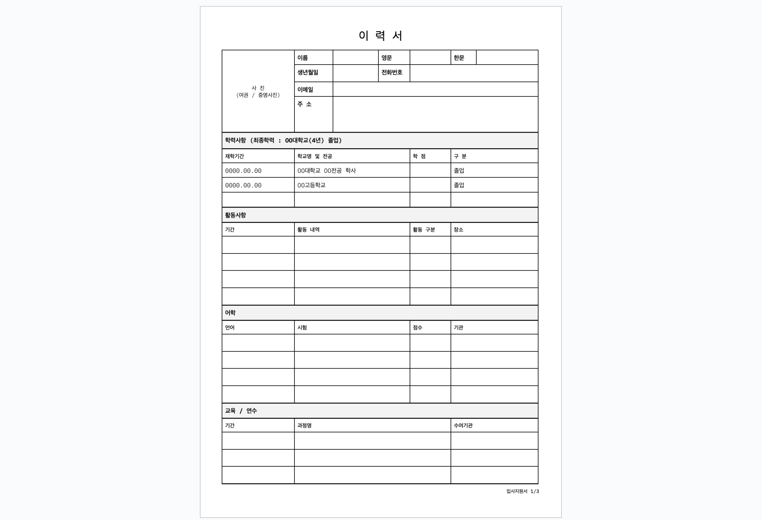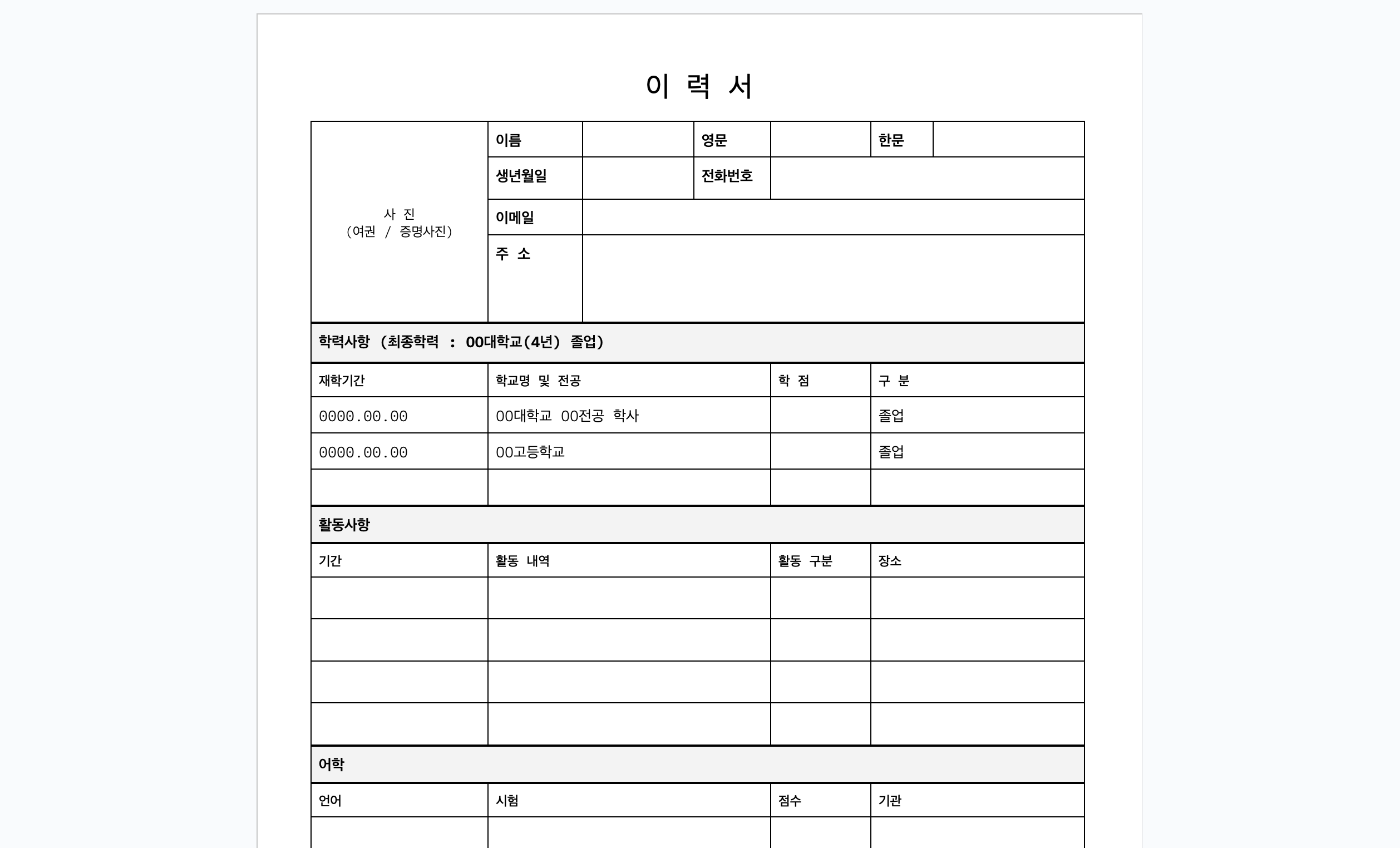 이 력 서 사 진 (여권 / 증명사진) 이름 영문 한문 생년월일 전화번호 이메일 주 소 학력사항 (최종학력 : OO대학교(4년) 졸업) 재학기간 학교명 및 전공 학 점 구 분 0000.00.00 OO대학교 OO전공 학사 졸
