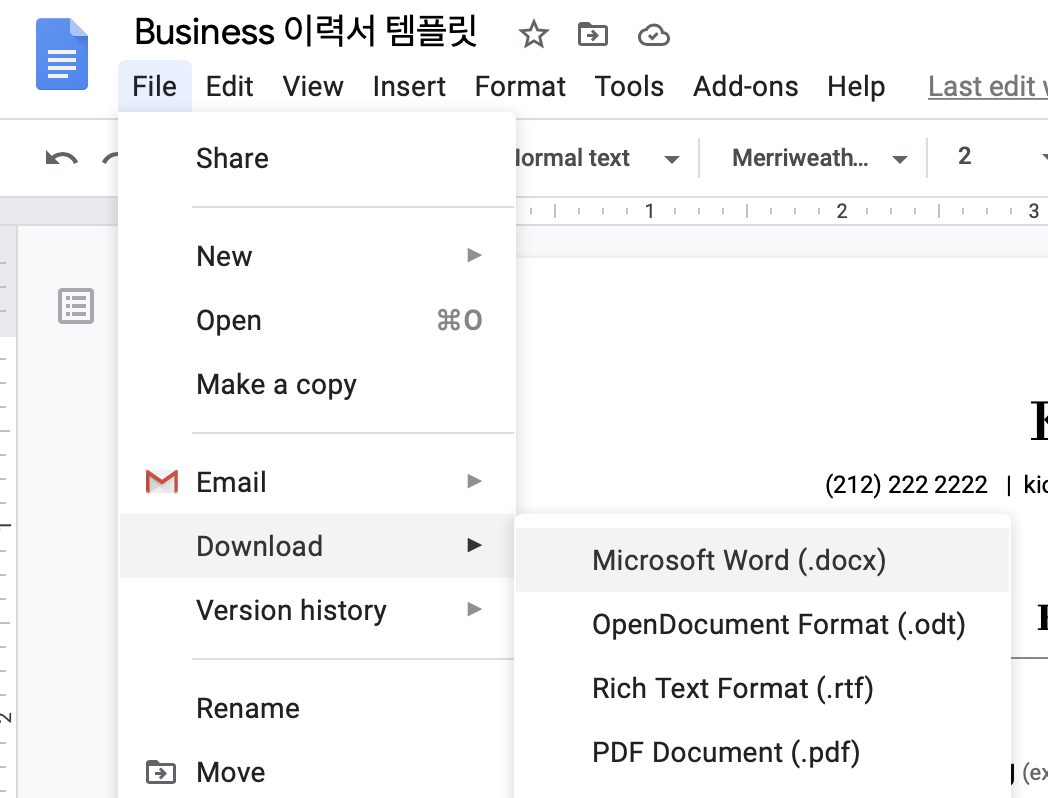 파일(File) > 다운로드(Download)에서 원하는 파일 형식을 선택하시면 됩니다.