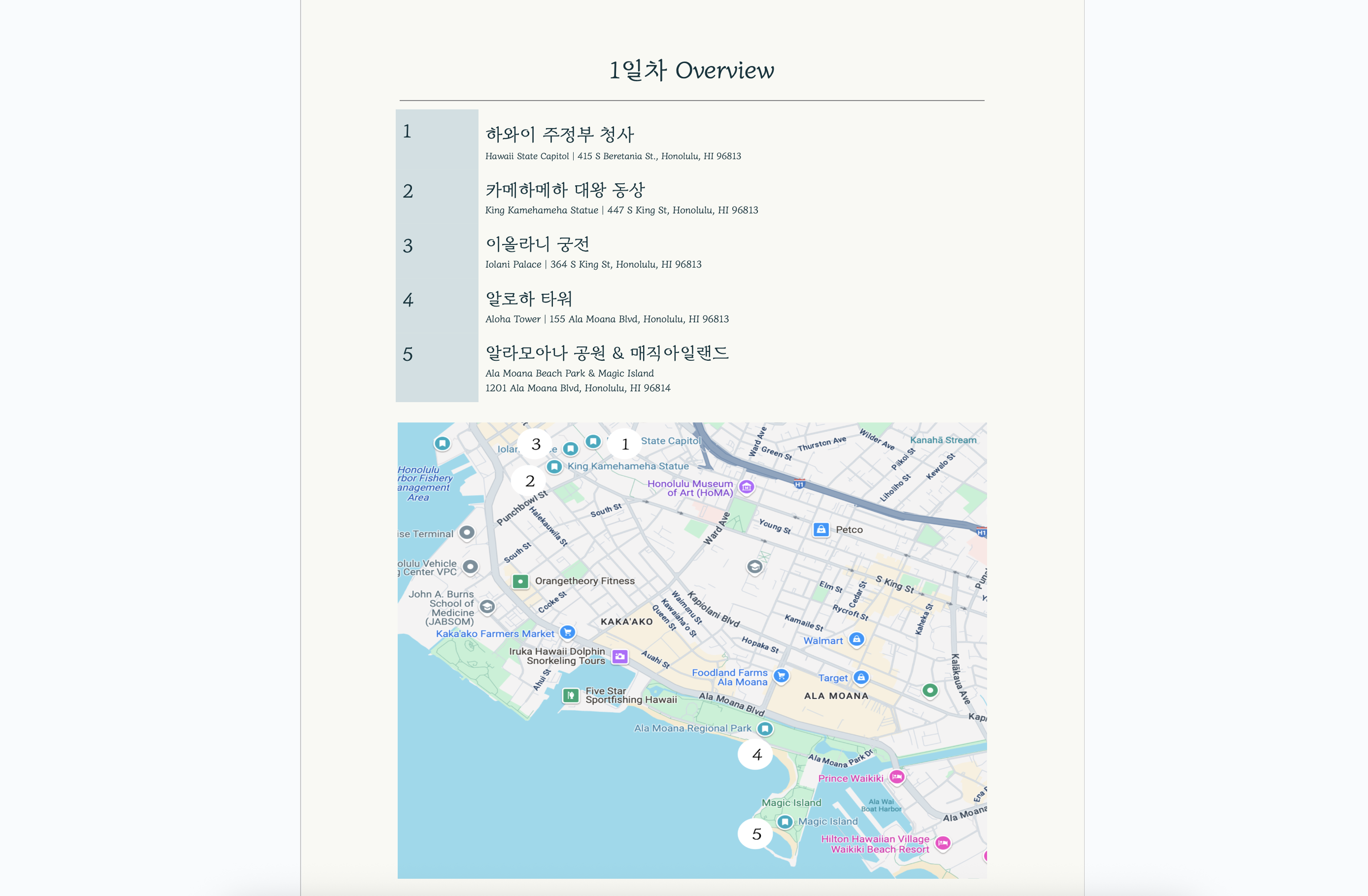 제가 오늘 가져온 양식은 해외 / 국내 여행을 갈 때, 목적지와 각 일차의 일정 계획에 대해서 소개하는 여행계획서 및 일정표 양식입니다. 지난 번에 올린 여행 일정표 양식과는 달리, 각 목적지에 대한 상세사항이 적혀져 있고, 준비물과 교통수단, 시간 등은 생략되어 있으니 참고하세요. 여행지에 대해 자세한 내용을 소개하고 싶을 때, 제가 만든 무료 여행 계획서 템플릿으로 편하게 작업하세요.