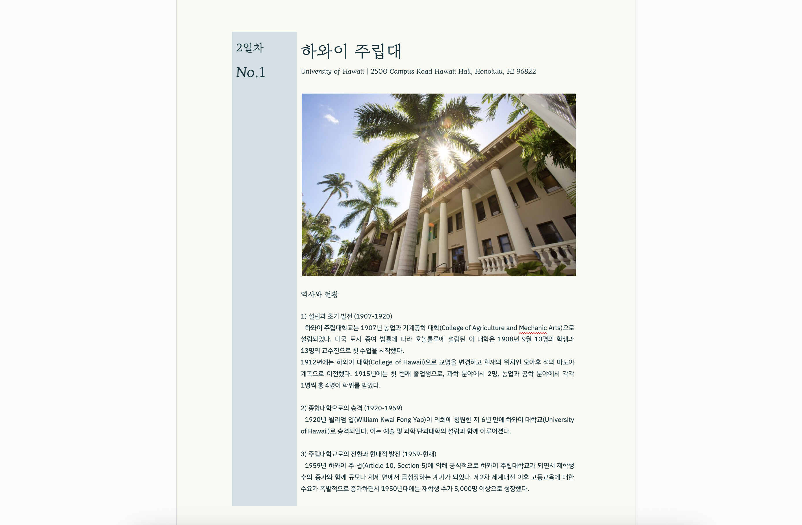이국 땅에서 우리 민족의 얼을 만나다– 하와이 여행 계획서 목 차 하와이 개요 2 1일차 10 2일차 20 3일차 33 4일차 39 하와이 개요 1. 지리적 위치 및 자연 환경 북태평양 중앙부에 위치한 하와이 제