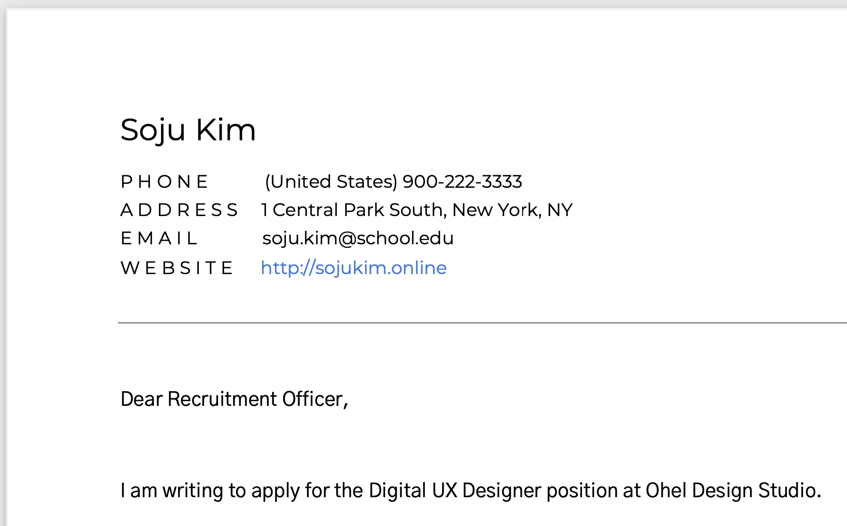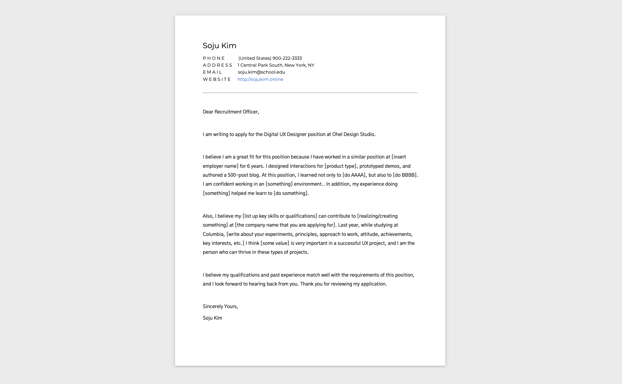 Soju Kim P H O N E (United States) 900-222-3333 A D D R E S S 1 Central Park South, New York, NY E M A I L soju.kim@school.edu W E B S I T E http://sojukim.online Dear Recruitment Officer, I am writing to apply for the Digital UX Designer position at Ohel