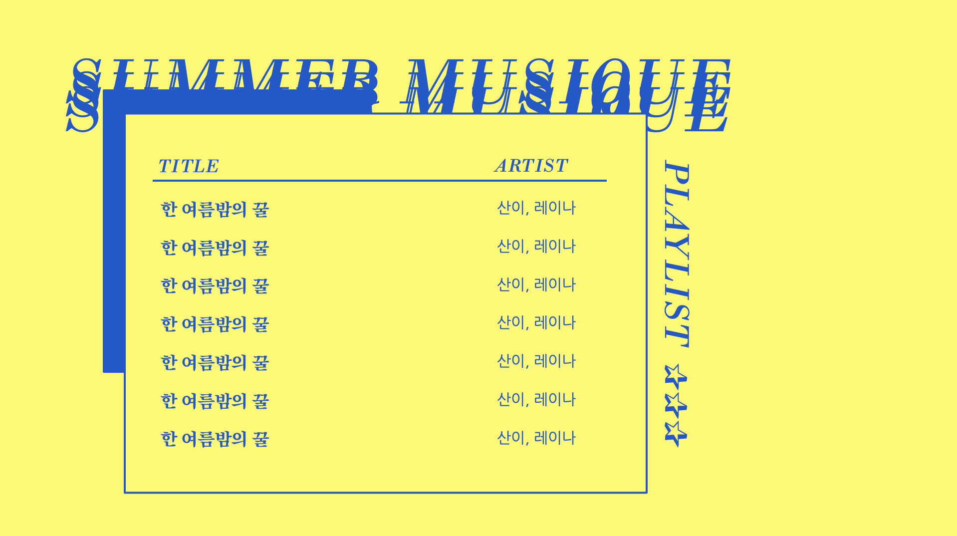 오늘은 다같이 모여서 음악 틀어놓고 놀 때, 야외에서 음악틀고 디제잉 할 때, 루프탑 바베큐 파티할 때, 혹은 자신의 플레이리스트를 남에게 공유할 때 띄워놓기 좋은 썸머뮤직 팝 플레이리스트 파워포인트 양식을 디자인해 보았습니다.
