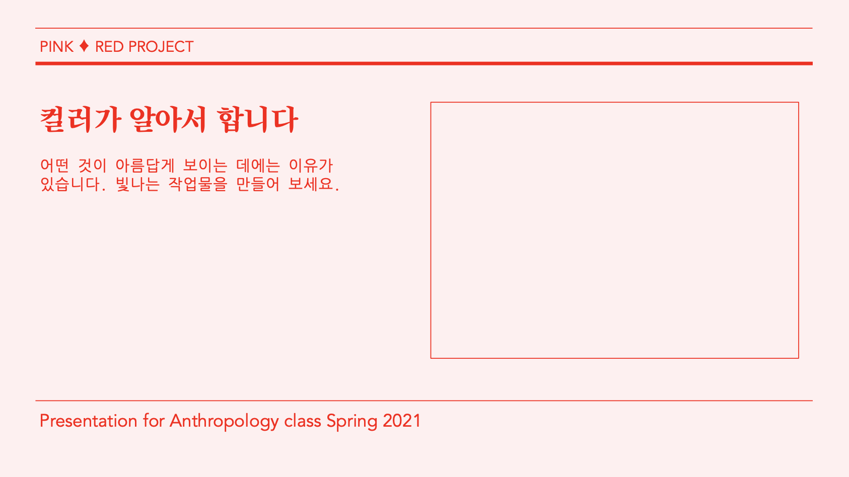 예전에 백화점에서 옷을 살 때, 레드 스커트를 가지고 고민하니까 점원 분이 아주 옅은 핑크색 가디건을 가져다 주시면서 핑크와 레드는 많이 알려지지 않은 꿀조합이라고 조언해 주시던 게 생각이 났습니다. 😂 막상 파워포인트 템플릿을 만들고 보니, 정말 맞는 말이었어요.