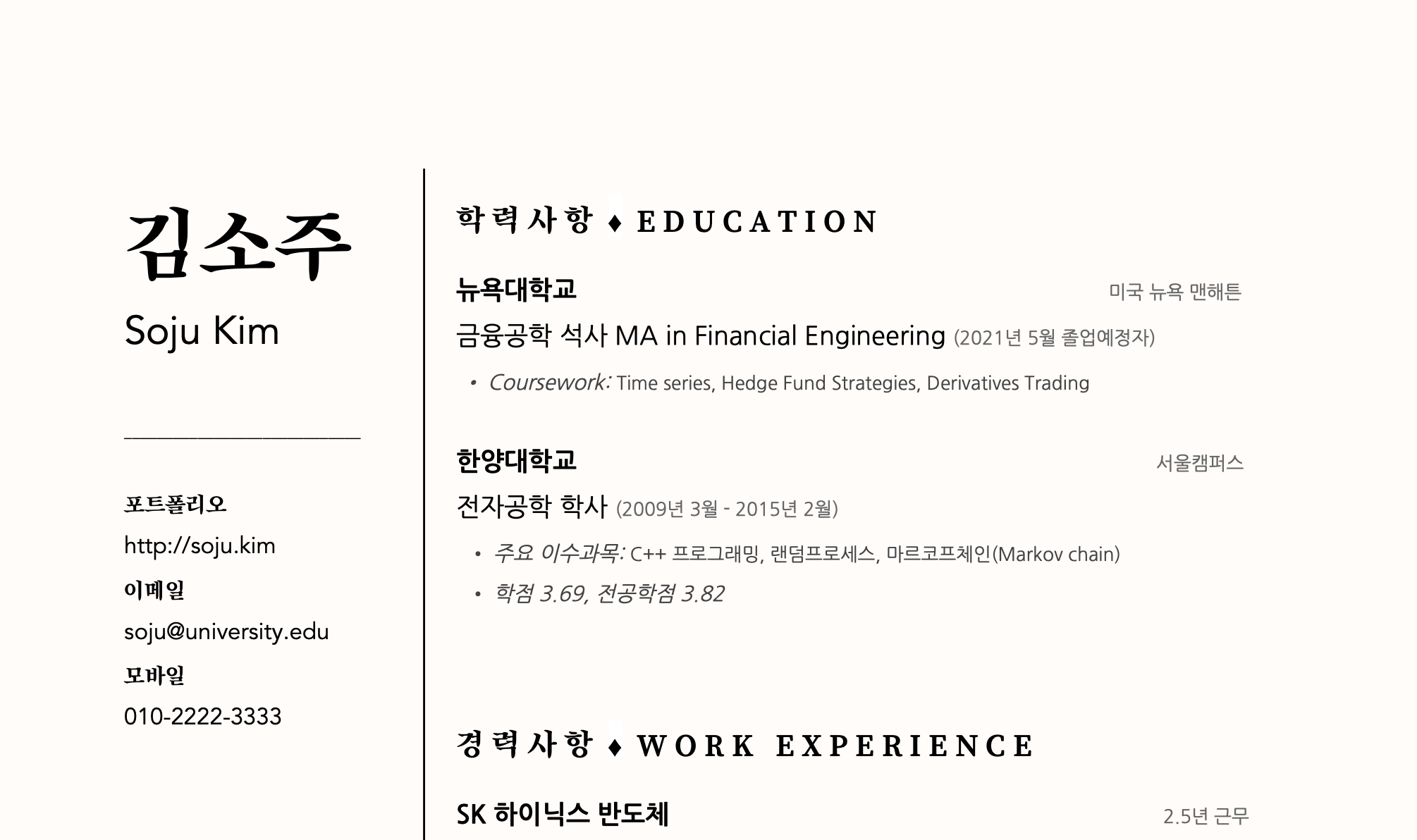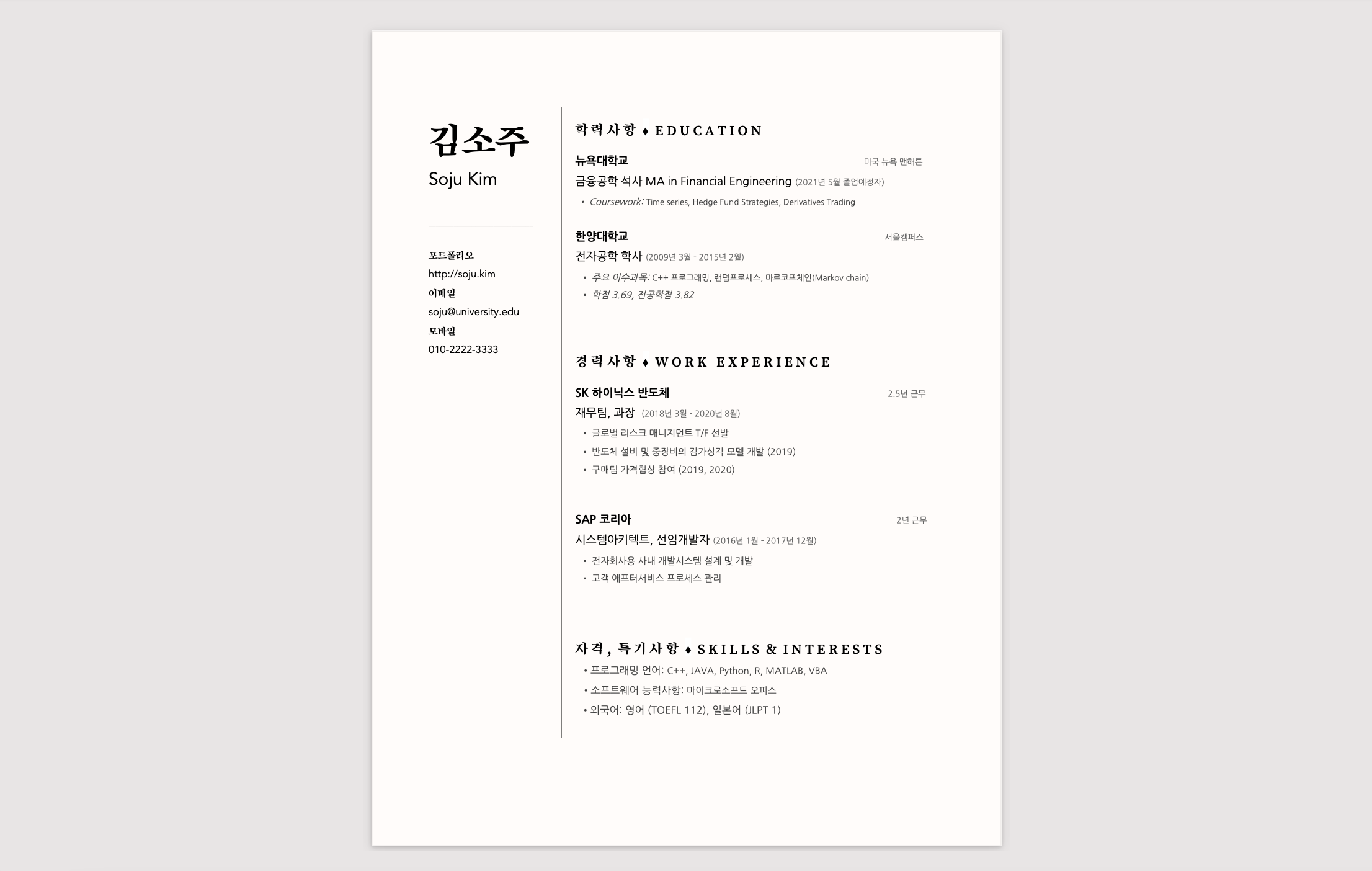김소주 Soju Kim _____________________________ 포트폴리오 http://soju.kim 이메일 soju@university.edu 모바일 010-2222-3333 학 력 사 항 ♦ E D U C A T I O N 뉴욕대학교 미국 뉴욕 맨해튼 금융공학 석사 MA in Financial Enginee