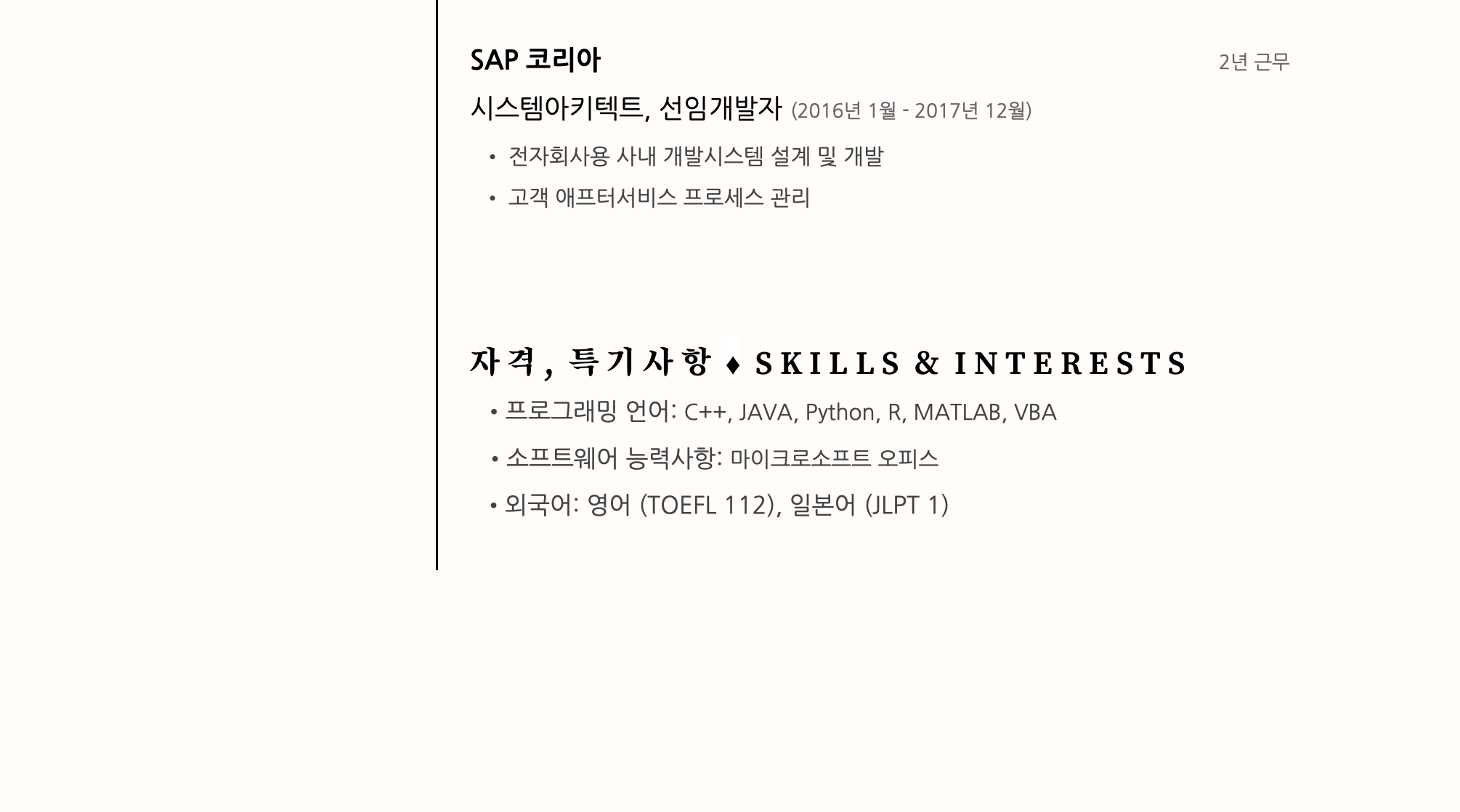 해당 무료 템플릿은 제가 직접 구글닥(Google Docs)에서 제공하는 기본 한글 및 영문 폰트와 기능만을 가지고 디자인 및 제작하였습니다. 입력된 모든 내용은 샘플 이력서로써, 가상의 인물에 대한 내용으로 지어낸 내용입니다. 실존하는 인물의 정보가 아님을 알려 드립니다.