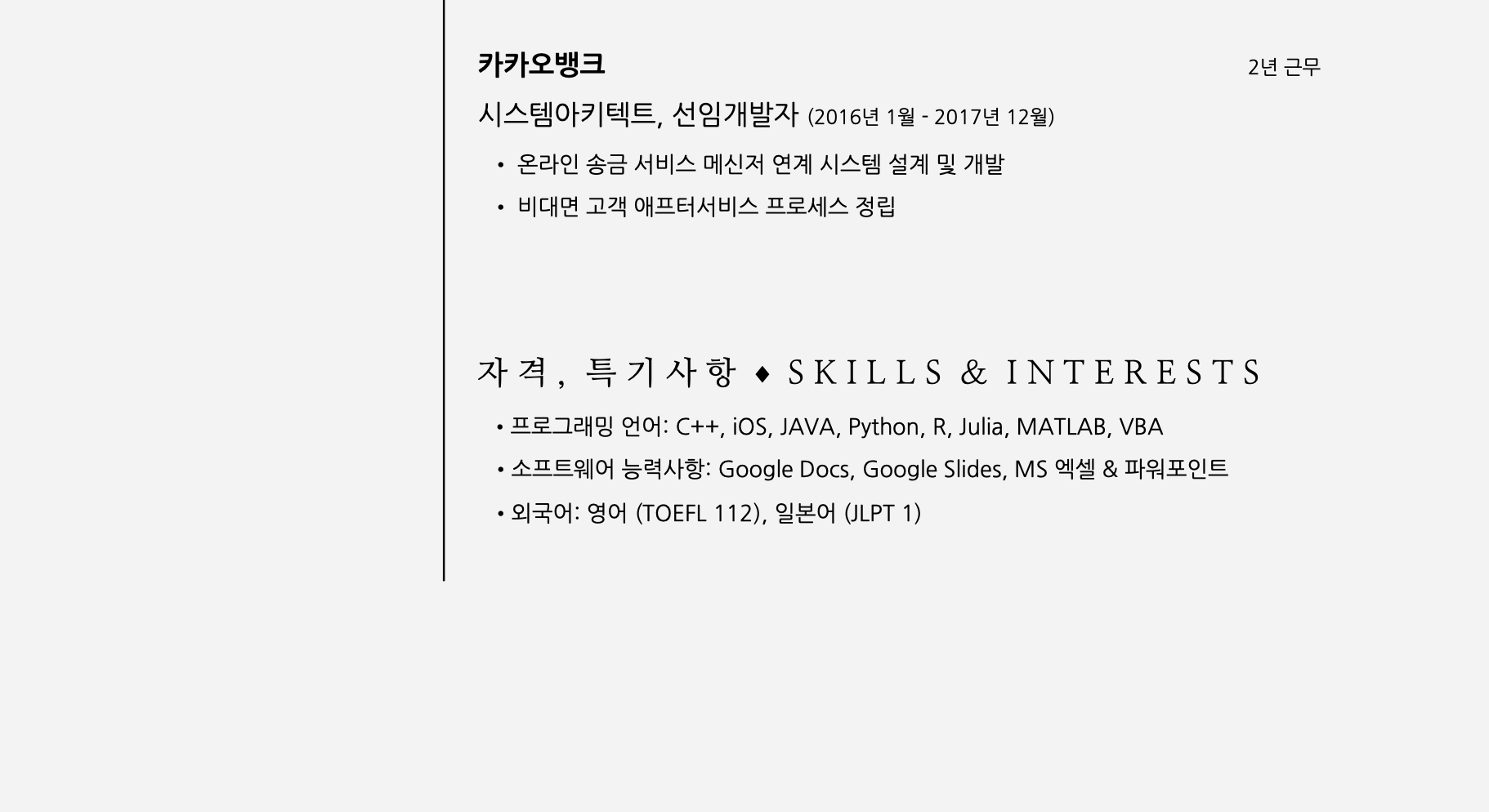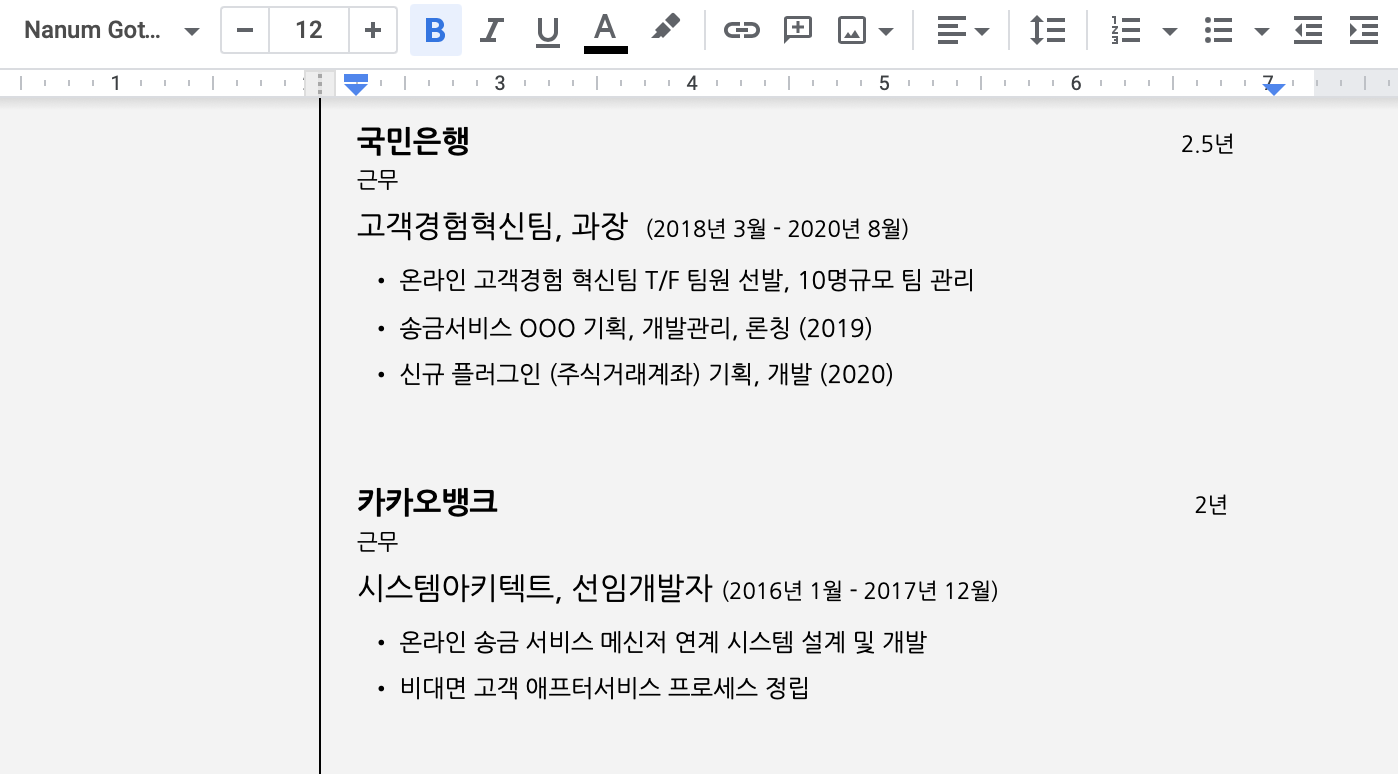 템플릿 링크를 열어보시면, 아래와 같이 "2.5년 근무"와 같은 글자들이 조금 어긋나 있음을 보실 수 있습니다. 저렇게 해 둔 이유는, 실제로 PDF로 다운받았을 때에 반듯하게 나오려면 저 정도의 간격을 주어야 하기 때문입니다. 특별히 다른 이유가 있는 것은 아니니, 본인 컴퓨터 환경에 맞춰서 조절해서 쓰시면 됩니다. PDF로 몇 번 다운로드 받아 보시면서 조절하시면 되겠습니다.