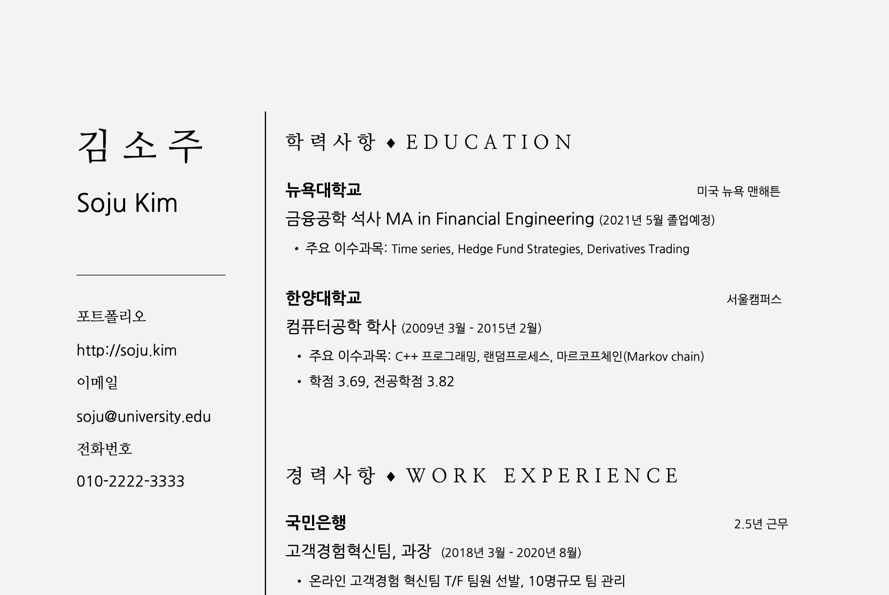 김 소 주 Soju Kim _____________________________ 포트폴리오 http://soju.kim 이메일 soju@university.edu 전화번호 010-2222-3333 학 력 사 항 ♦ E D U C A T I O N 뉴욕대학교 미국 뉴욕 맨해튼 금융공학 석사 MA in Financial En