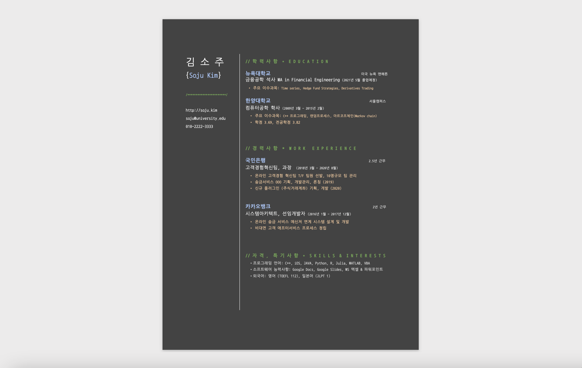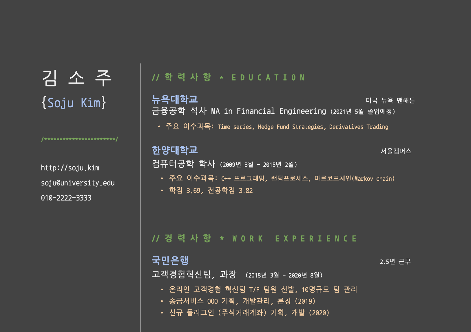 김 소 주 {Soju Kim} /***********************/ http://soju.kim soju@university.edu 010-2222-3333 // 학 력 사 항 * E D U C A T I O N 뉴욕대학교 미국 뉴욕 맨해튼금융공학 석사 MA in Financial Engineering (2021년 5월 졸업예정)