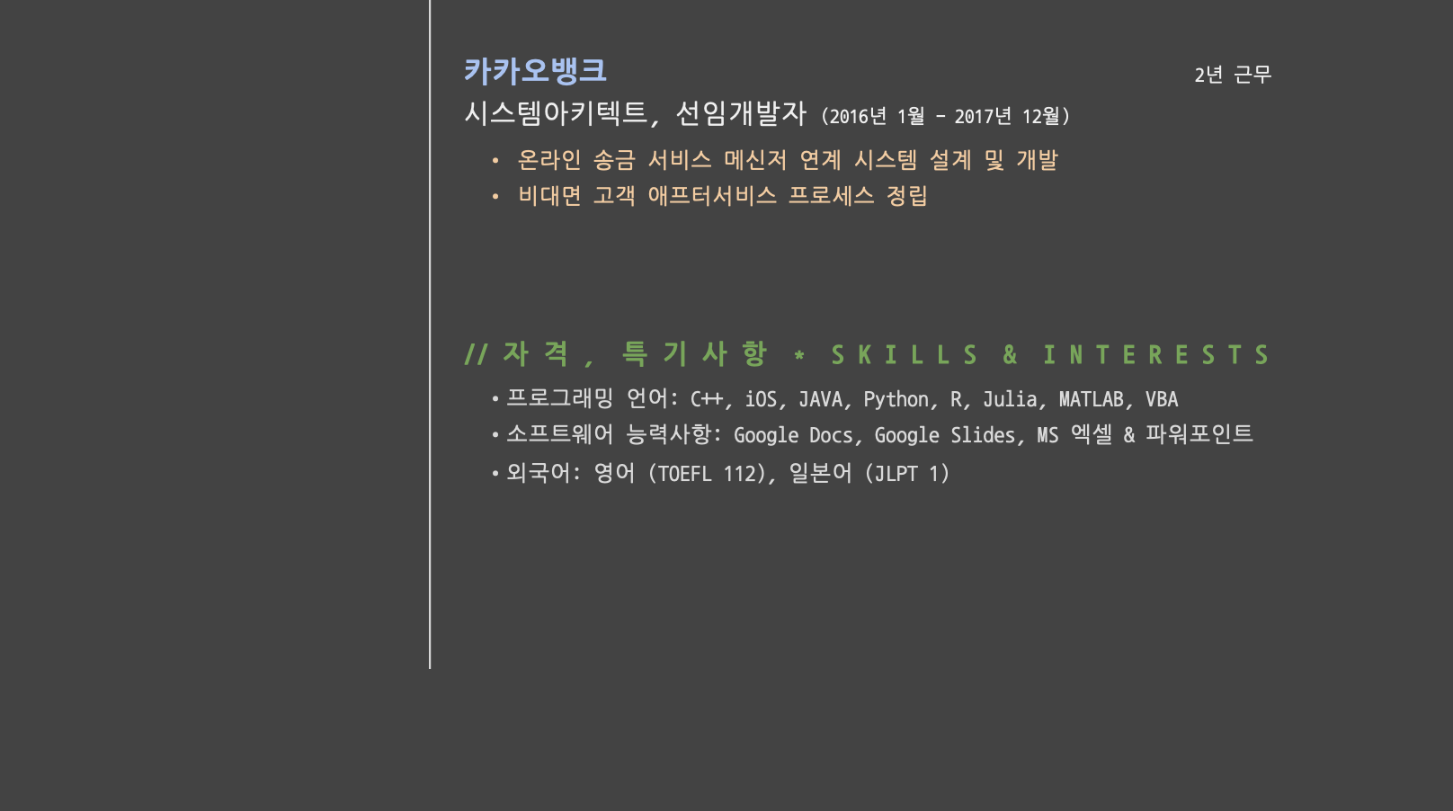 오늘은 구글닥(Google Docs)을 이용해서 비주얼 스튜디오 개발환경 느낌이 나는 개발자 분들을 위한 한글이력서 양식을 준비해 보았습니다. 오늘 양식은 솔직히 말씀드리면 실제로 취업에 사용하기에는 조금 리스크가 있어 보입니다. 😂 대학교 동아리나 동호회, 알고리즘스터디 등 개발자 단체에 지원하실 때, 혹은 지원을 받는 용도로 재미로 사용해 보시면 좋을 것 같습니다.