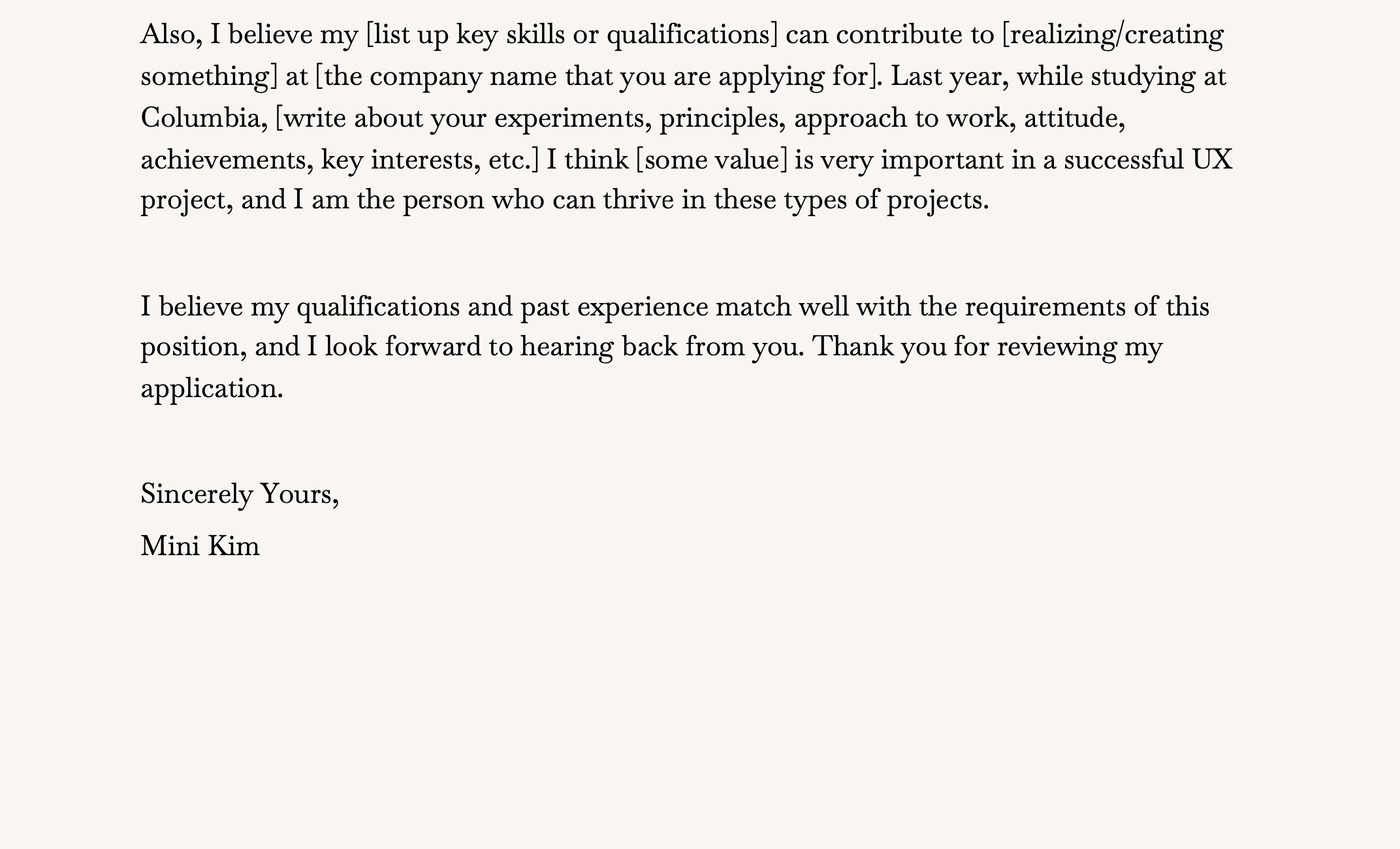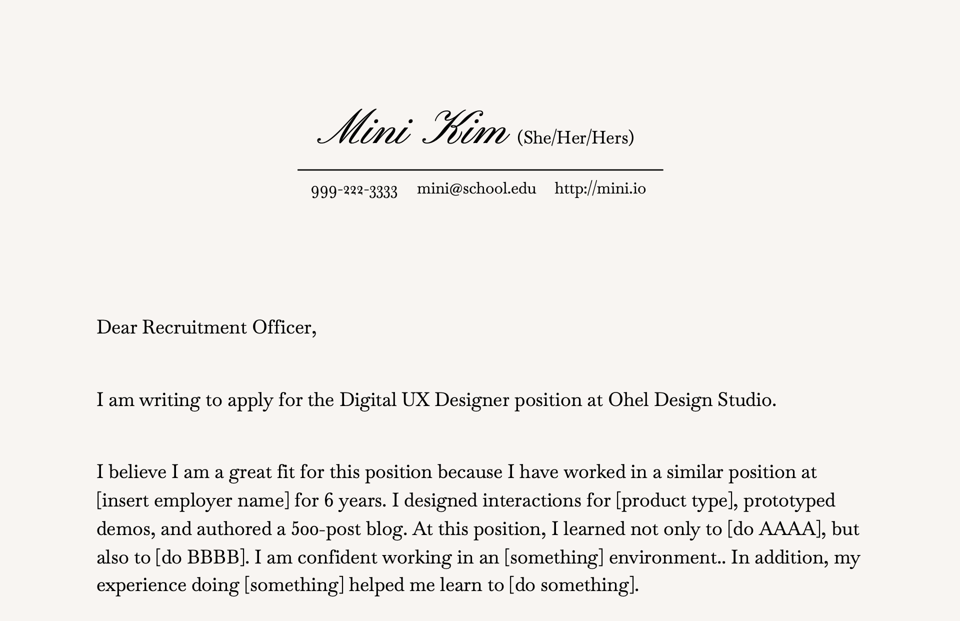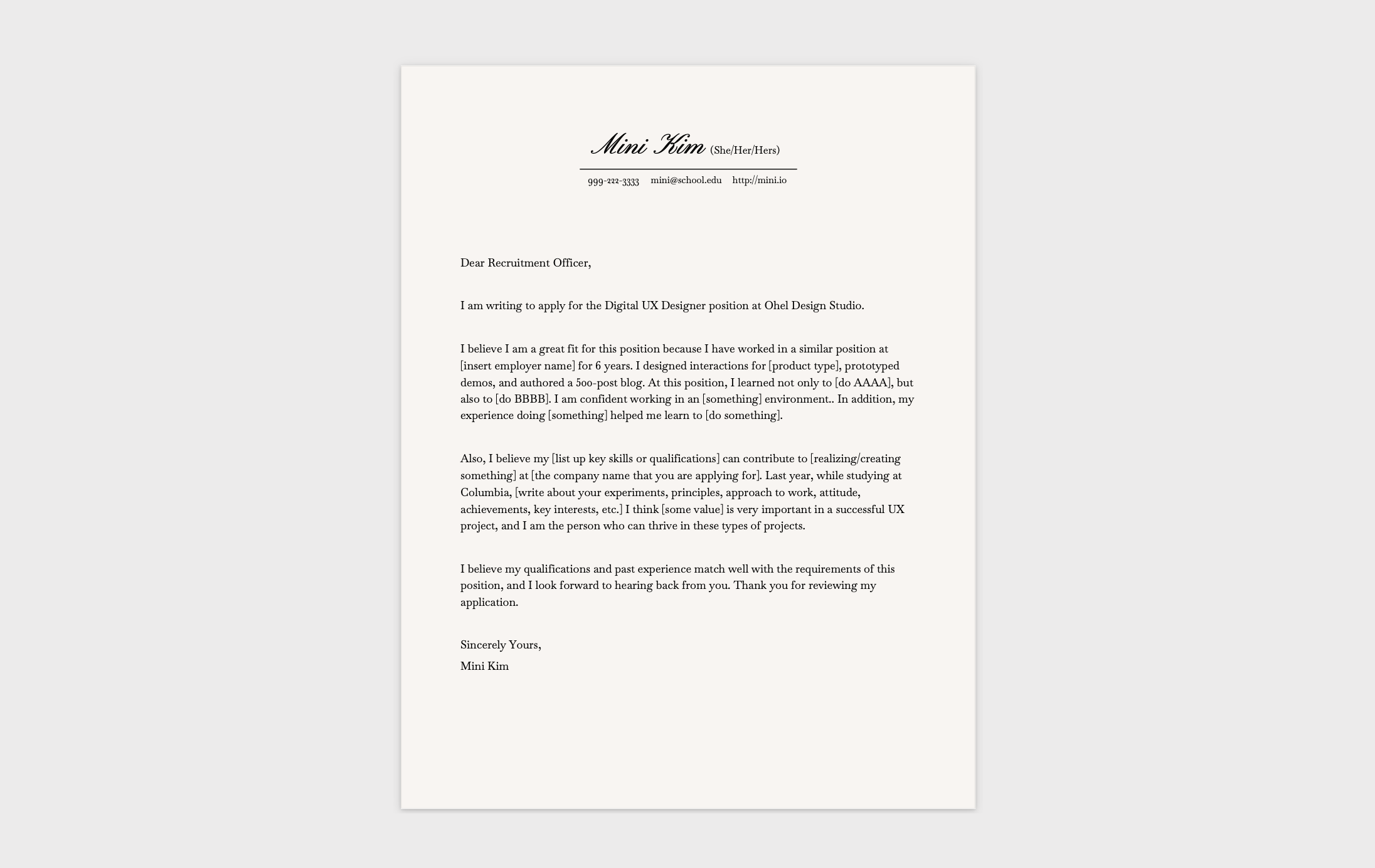Mini Kim (She/Her/Hers) 999-222-3333 mini@school.edu http://mini.io Dear Recruitment Officer, I am writing to apply for the Digital UX Designer position at Ohel Design Studio. I believe I am a great fit for this position because I have worked in a similar