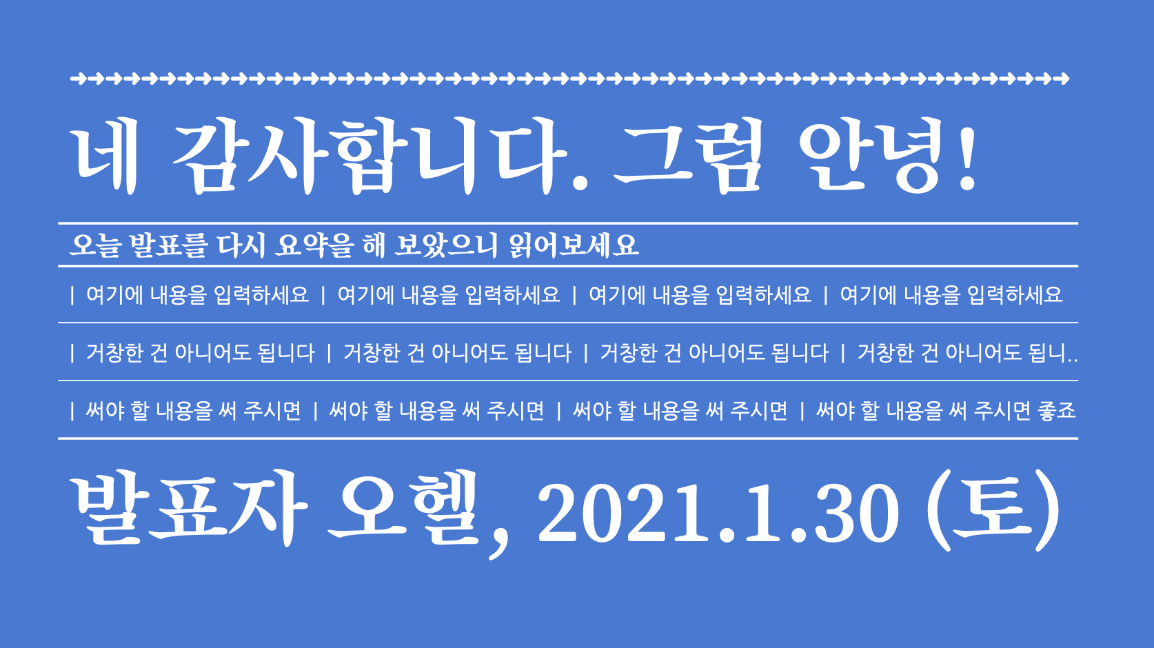 이번에는 흰색 배경과 블루 배경 두 가지를 준비해 보았습니다. 블루는 신뢰감과 청량감을 주고, 약간의 무게감이 있는 색깔이기 때문에 전문적으로 보이고 또 거의 모든 과목과 주제에 잘 어울립니다. 시원하고 믿음이 가는 느낌을 주려면 써 보세요. 글로벌 기업 중 상당 수가 로고에 블루 컬러를 사용하는 데에는 다 이유가 있습니다. 고급스럽고, 여러 주제와 잘 어울려서 그렇습니다. 😊