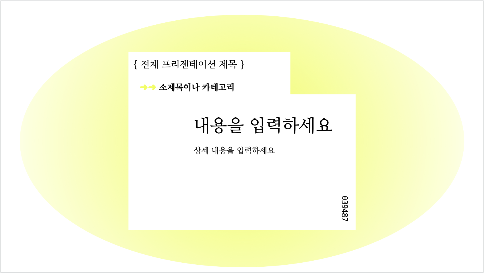 약간 녹색이 섞인 네온옐로 (레몬옐로 라고도 하죠) 컬러의 타원형 바탕에 흰 색으로 미니멀한 텍스트 박스 몇 개만 배치하여 만든 디자인입니다. 새로운 내용, 공상과학적인 내용, 트렌드 관련 요약 등 새롭고 디지털문화와 관련된 발표나 과제를 제출할 때 쓰시기에 좋습니다.
