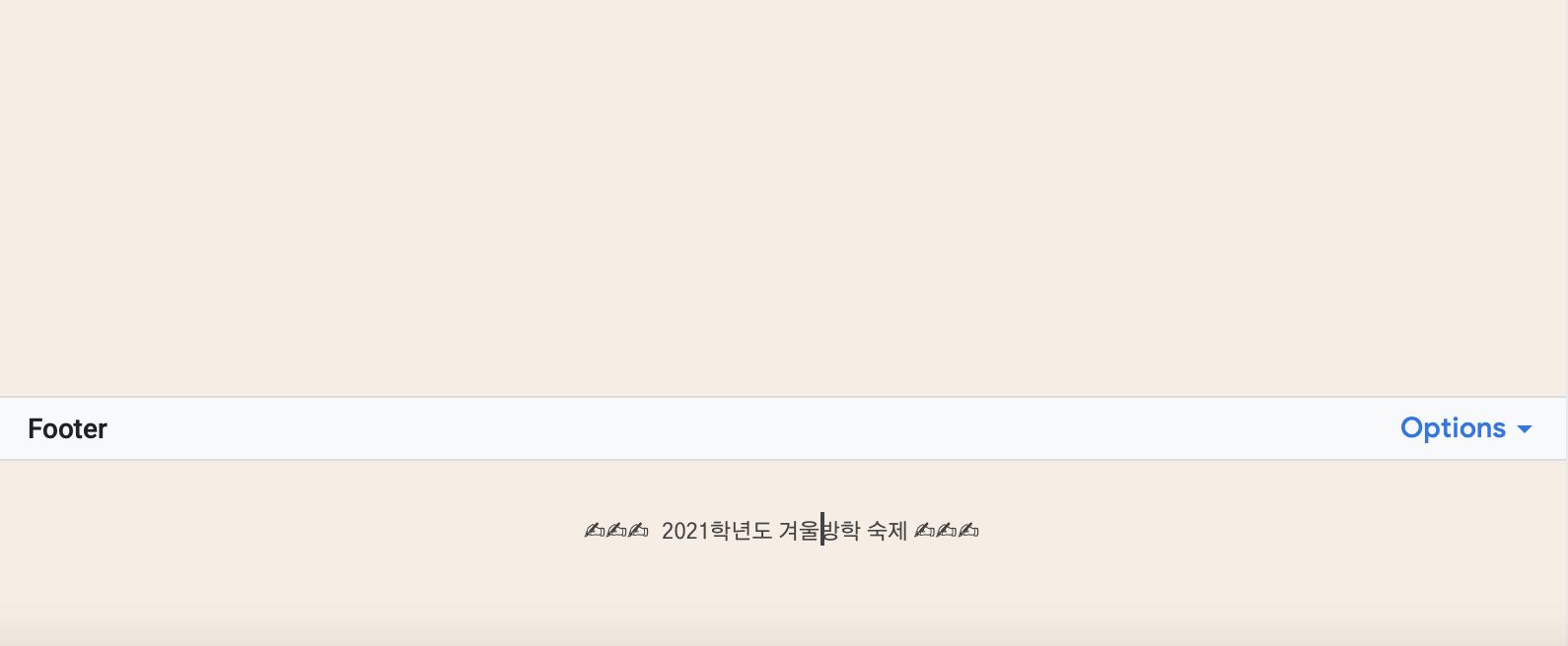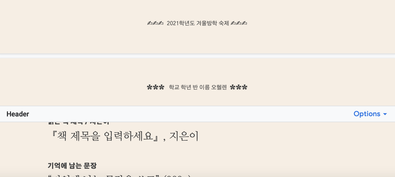 위에 "학교 학년 반 이름 오헬렌"이라는 부분을 수정하시려면 그 주변을 더블클릭해주시면 수정하실 수 있습니다. 실제로 더블클릭을 해 보시면 아래 사진과 같이 수정할 수 있는 상태로 변경됩니다. 마찬가지로, 아래 "2021학년도 겨울방학 숙제"라고 쓰여진 부분 또한 같은 방식으로 더블클릭해서 다른 내용으로 바꿔주시면 됩니다.