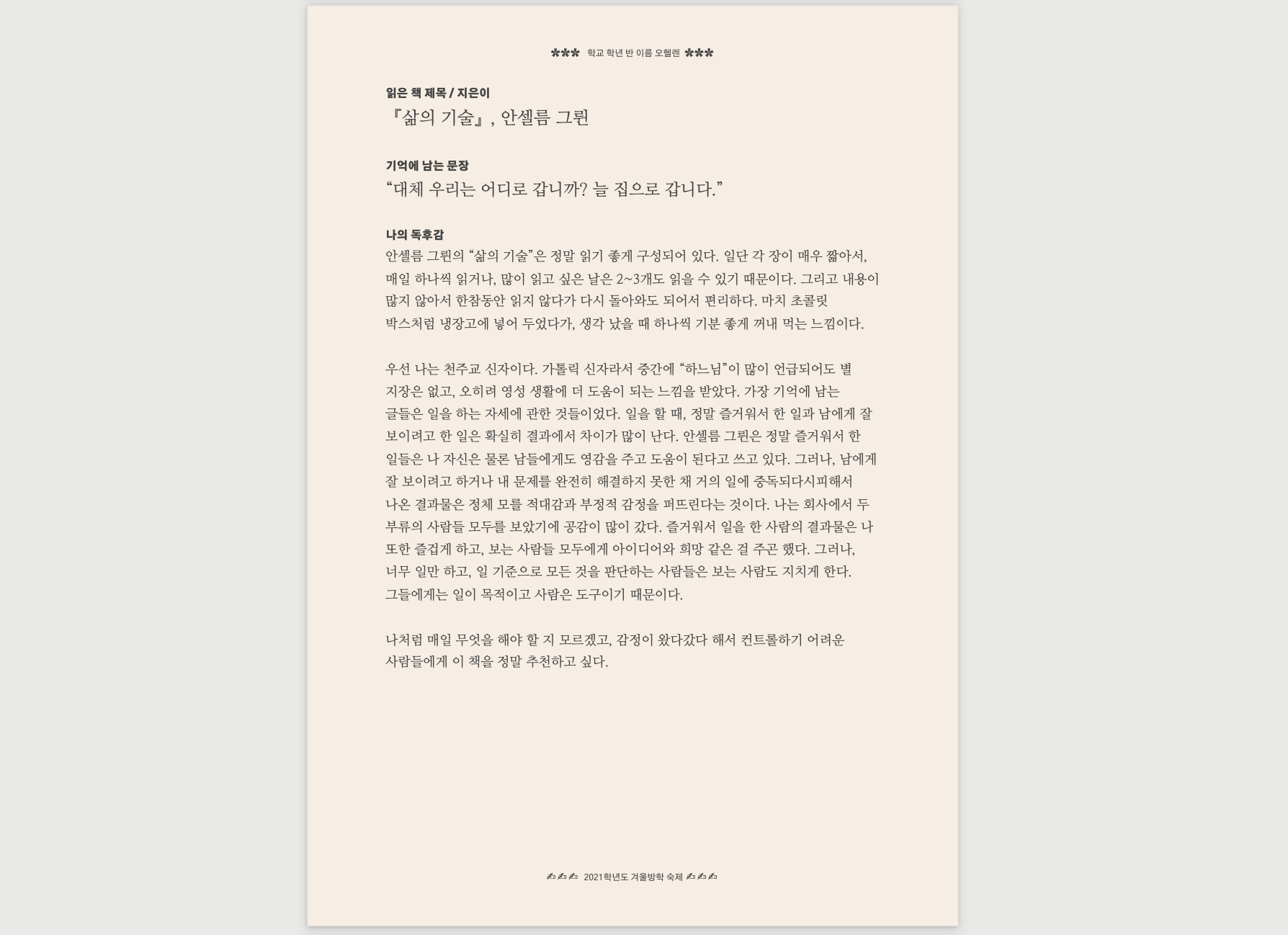 ✵✵✵✵✵✵✵✵✵✵✵✵✵✵✵✵✵✵✵✵✵✵✵✵✵✵ 독후감 모음집 ✵✵✵✵✵✵✵✵✵✵✵✵✵✵✵✵✵✵✵✵✵✵✵✵✵✵ 000000000 학교 0학년 0반 오헬렌 읽은 책 제목 / 지은이 『삶