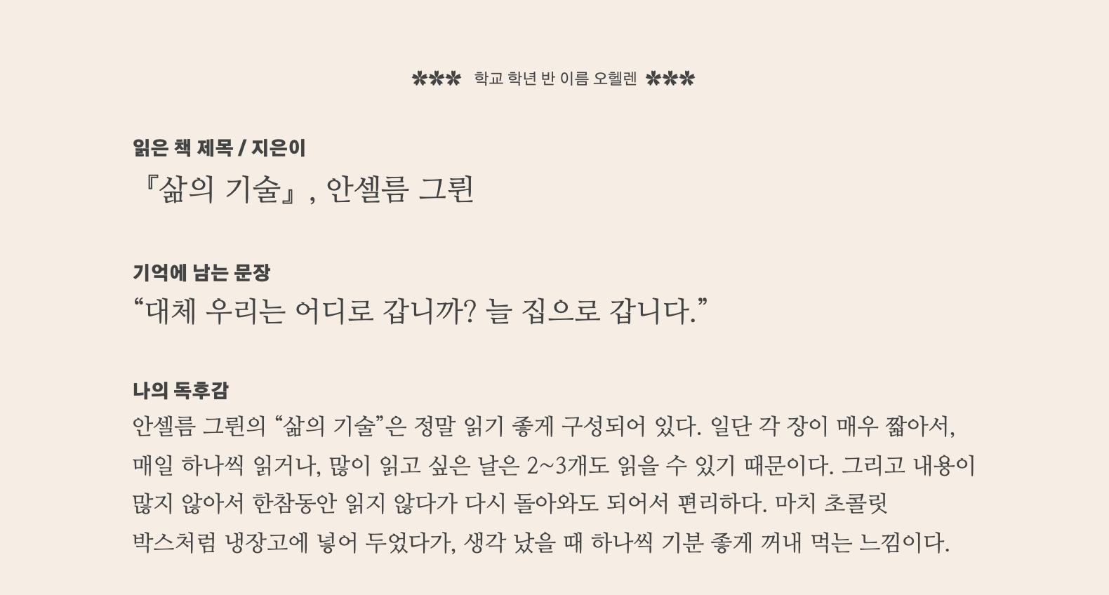 ✵✵✵✵✵✵✵✵✵✵✵✵✵✵✵✵✵✵✵✵✵✵✵✵✵✵ 독후감 모음집 ✵✵✵✵✵✵✵✵✵✵✵✵✵✵✵✵✵✵✵✵✵✵✵✵✵✵ 000000000 학교 0학년 0반 오헬렌 읽은 책 제목 / 지은이 『삶